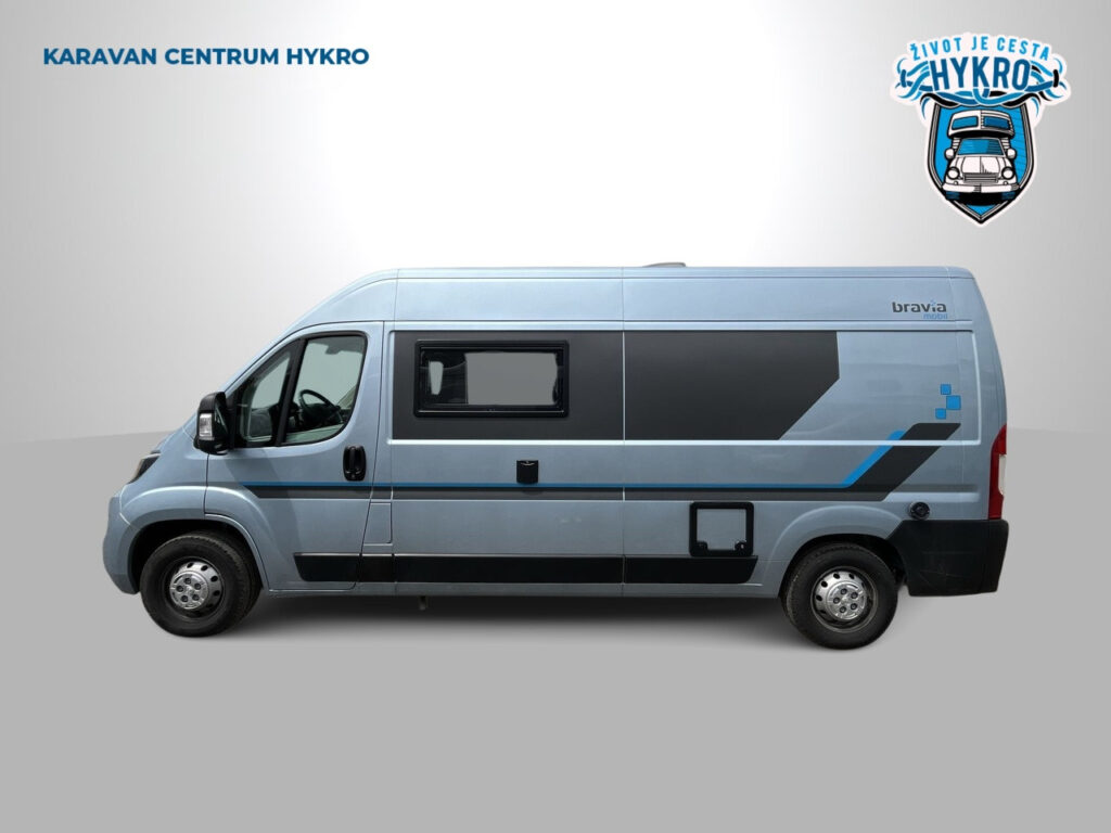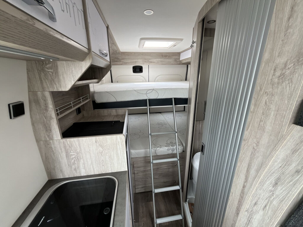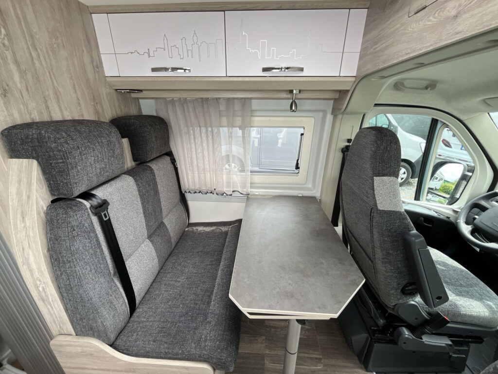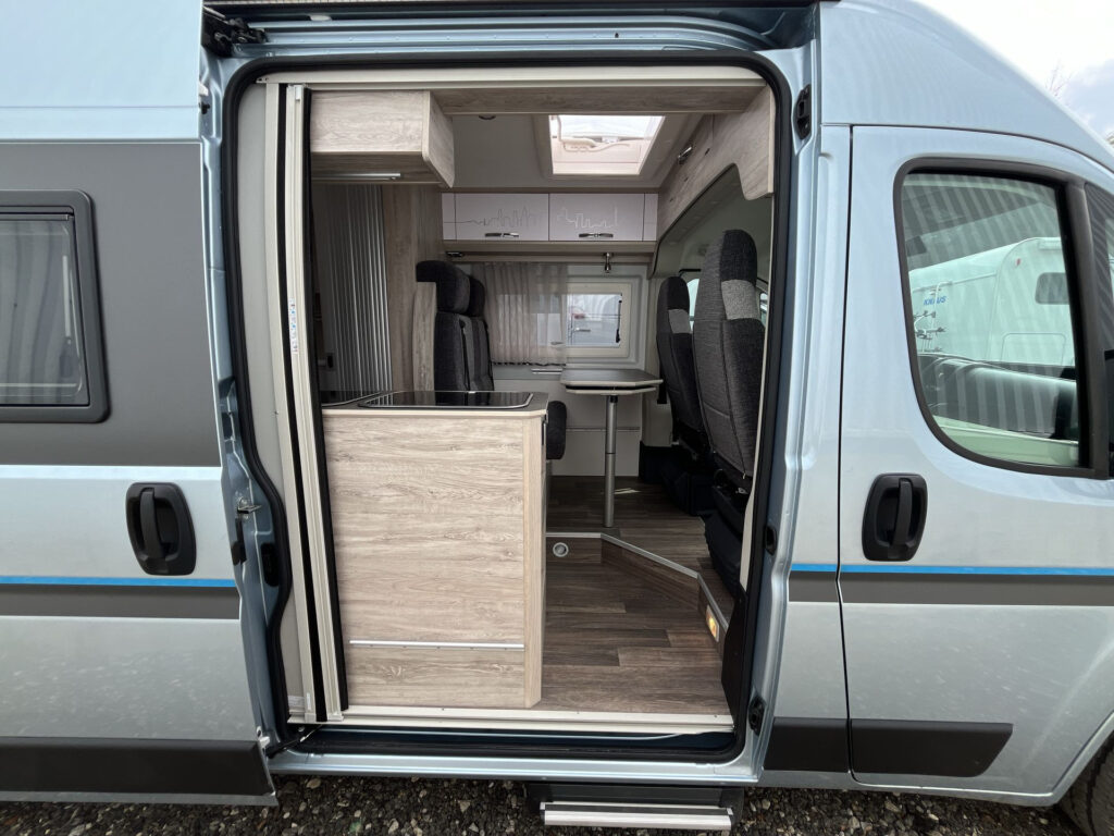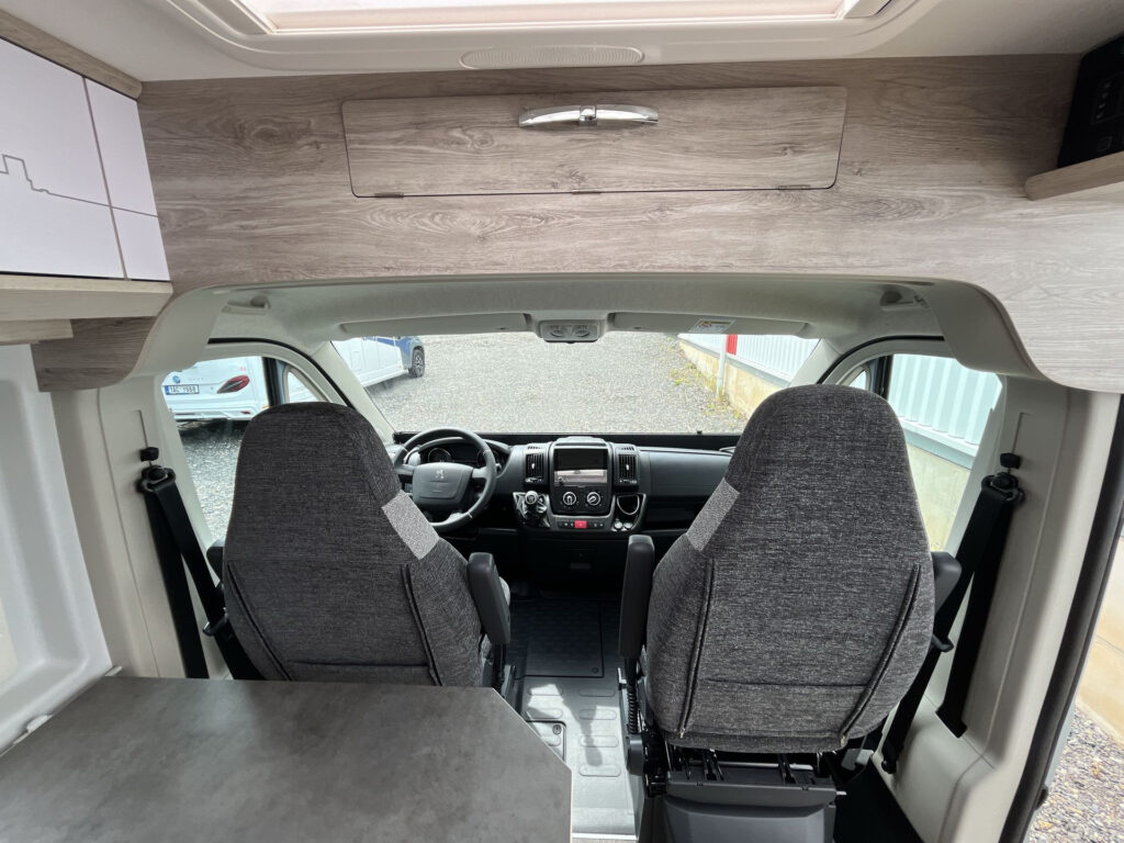 Další příplatková výbava skladového vozu: motor 165 PS, barva Azzuro Blue, přední nárazník v barvě vozu, zadní parkovací senzor se zvukovou výstrahou, LED denní světla, přední mlhovky, elektronický Drive Control, topení Truma Combi 4KW E CP Plus, DuoControl CS, ambientní LED osvětlení s dálkovým ovladačem, koberec kabiny řidiče a obytné části, vyhřívaná odpadní nádrž, venkovní přípojka na vodu, plyn a elektro (220V/12V/SAT), dřevěný rošt do sprchy, palanda + polohovací horní lůžko