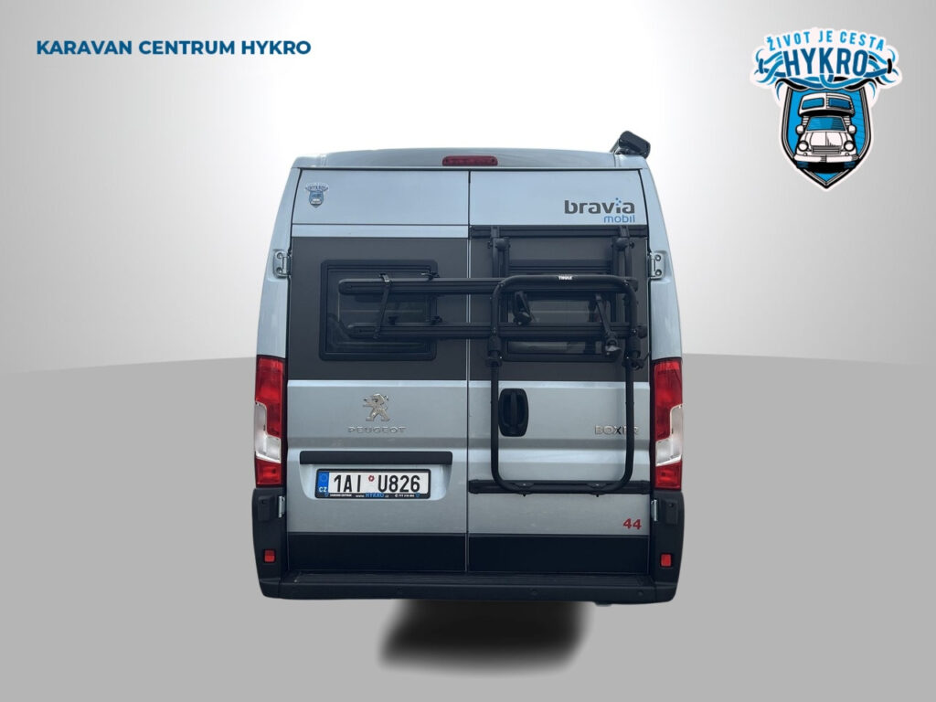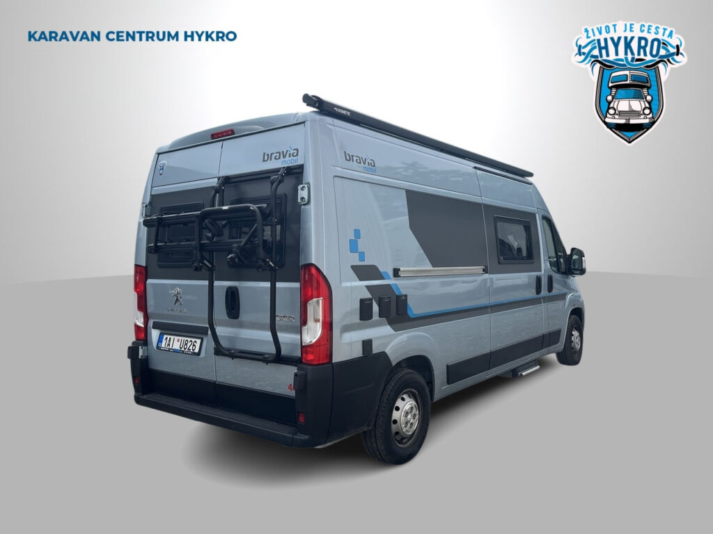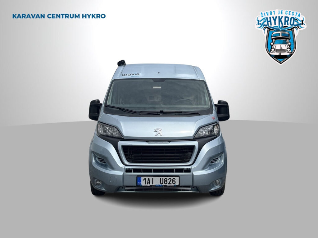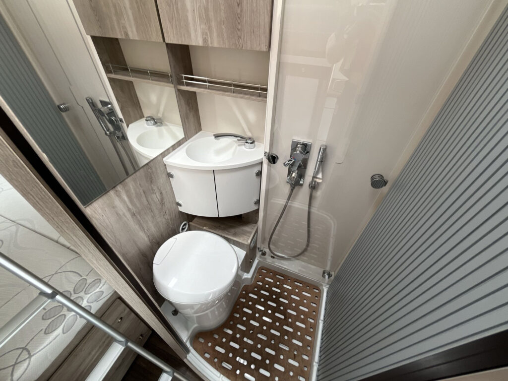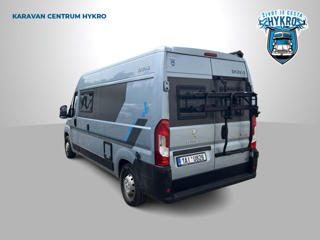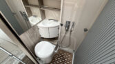 Další příplatková výbava skladového vozu: motor 165 PS, barva Azzuro Blue, přední nárazník v barvě vozu, zadní parkovací senzor se zvukovou výstrahou, LED denní světla, přední mlhovky, elektronický Drive Control, topení Truma Combi 4KW E CP Plus, DuoControl CS, ambientní LED osvětlení s dálkovým ovladačem, koberec kabiny řidiče a obytné části, vyhřívaná odpadní nádrž, venkovní přípojka na vodu, plyn a elektro (220V/12V/SAT), dřevěný rošt do sprchy, palanda + polohovací horní lůžko