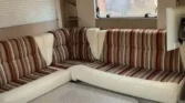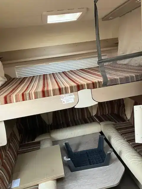 Rozkládací sezení do tvaru U, spouštěcí postel nad sedačkou, kuchyň, WC s umyvadlem a sprchou, palandy + rozkládací boční sezení