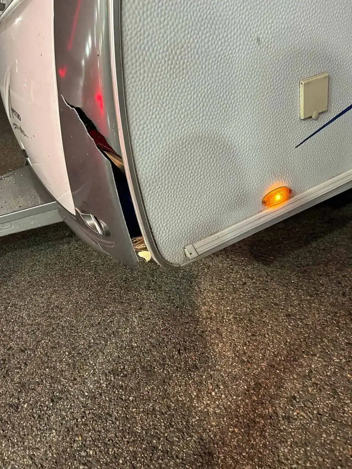 Karavanem jsme srazili srnu, praskl plastový kryt místa pro plyn. bomby a plastová/kompozitová podlaha tohoto místa. Bok karavanu není poškozen.