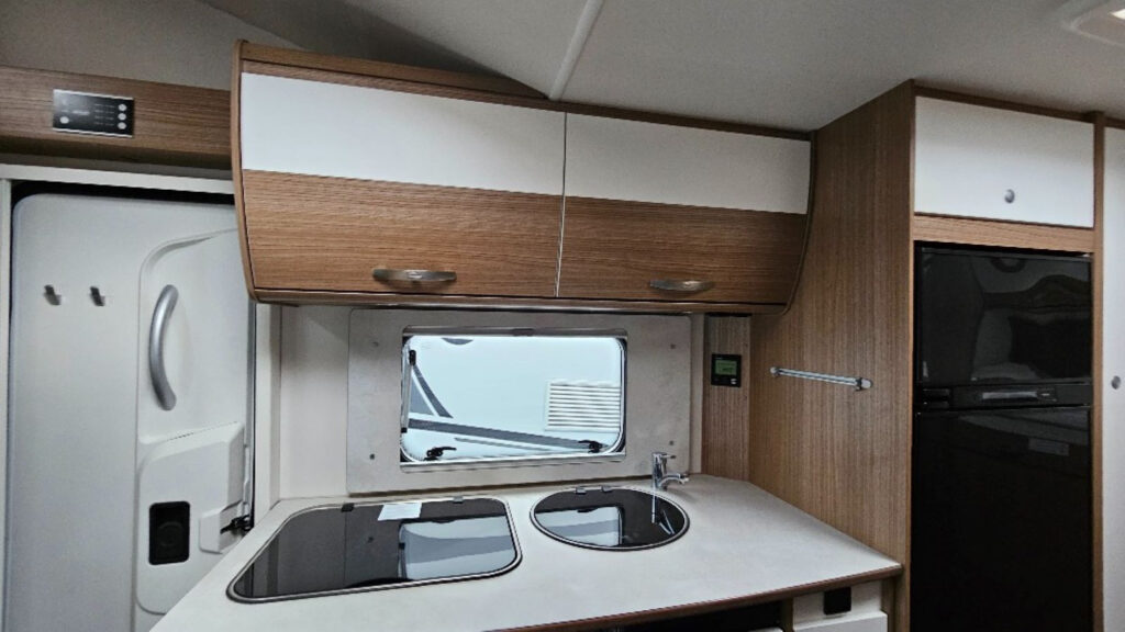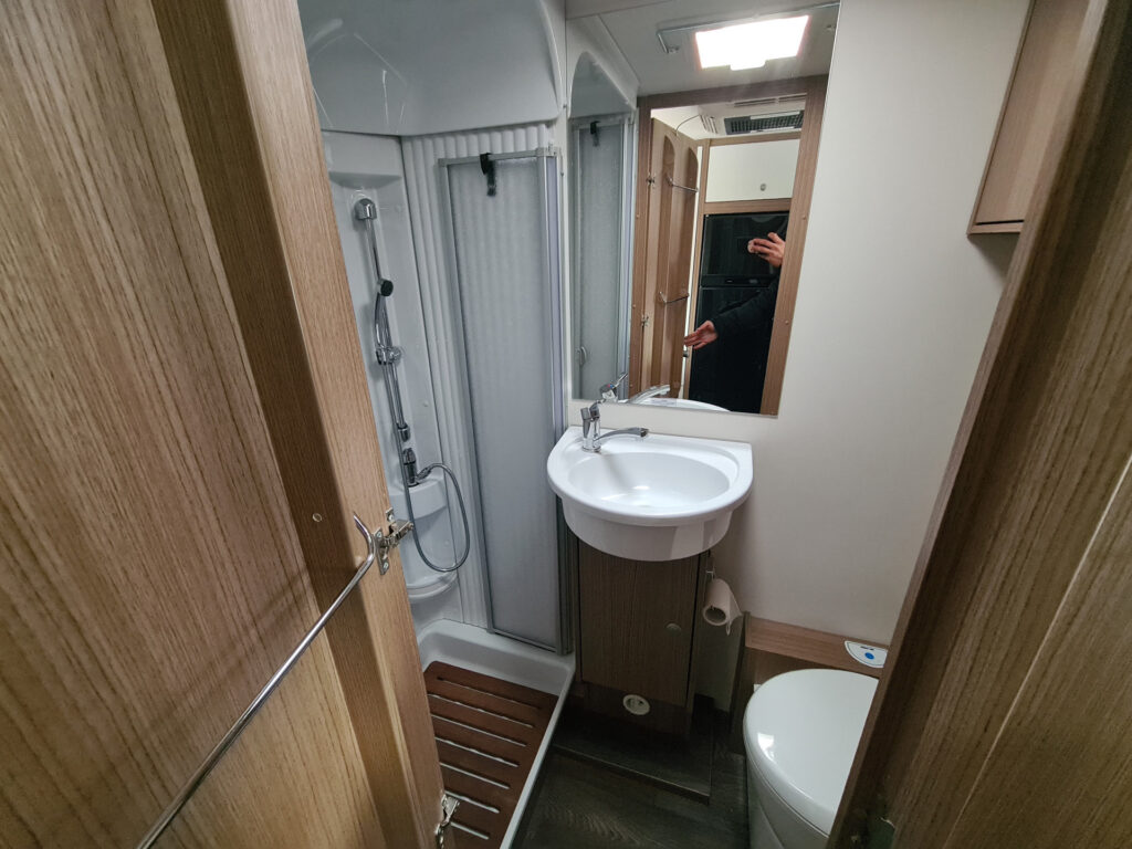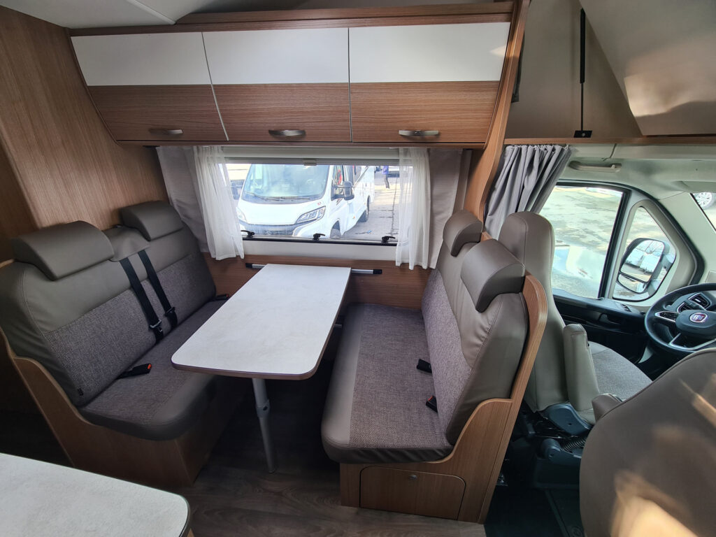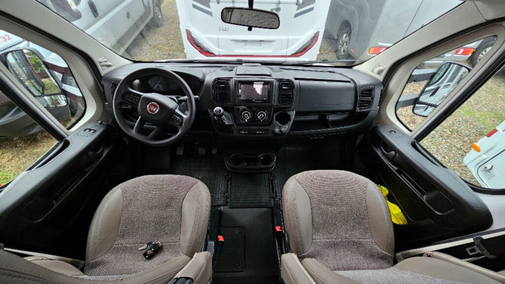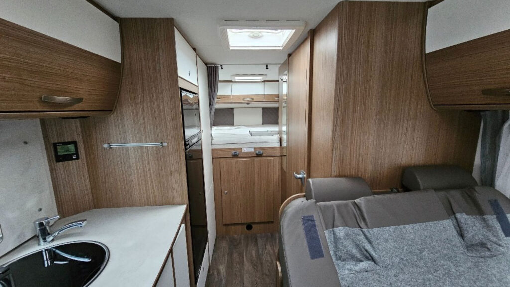 funkce Trakce vč. asistenta sjezdu z kopce, multifunkční volant, 16″ ocelová kola, nádrž nafty 90 l, druhé garážové dveře, izolovaná odpadní nádrž, dřevěný rošt do sprchy, velká lednice 167 l, topení Truma Combi 6E, příprava pro couvací kameru