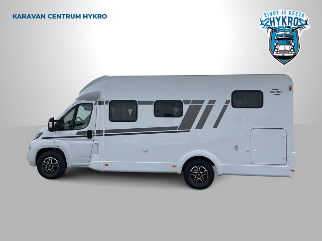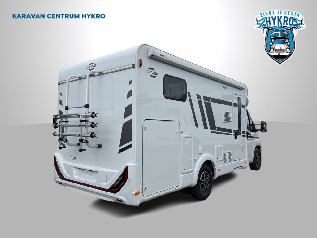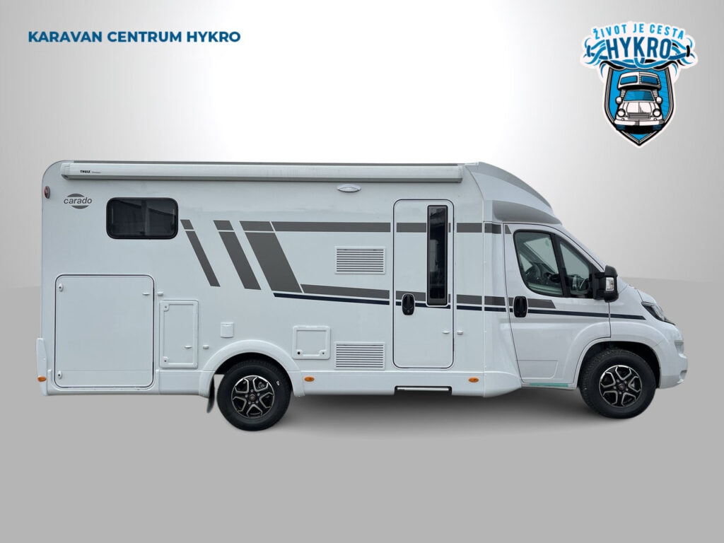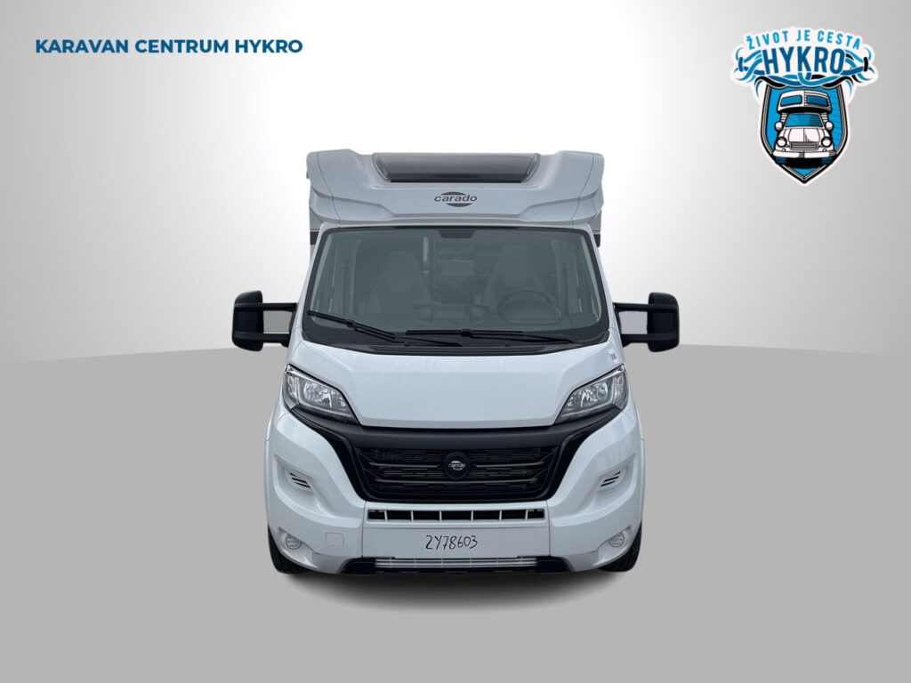 Rodinný polointegrovaný obytný vůz Carado T338 na podvozku Fiat Ducato pro 4 osoby na jízdu i na spaní v oblíbeném půdorysu s automatickou převodovkou skladem.