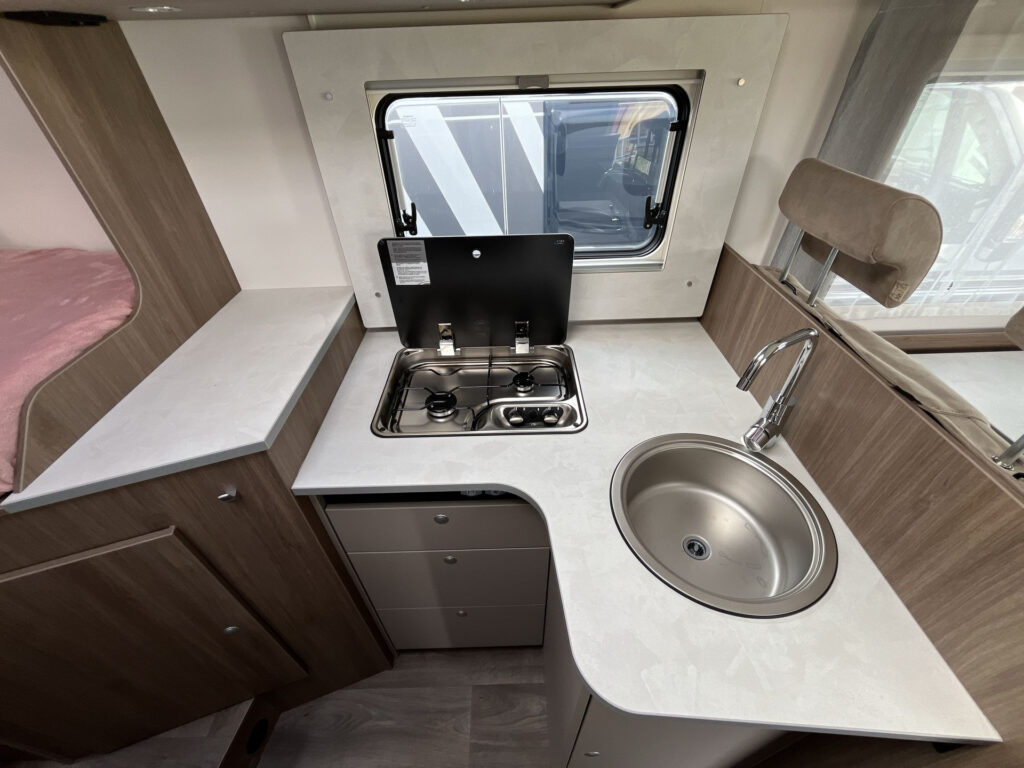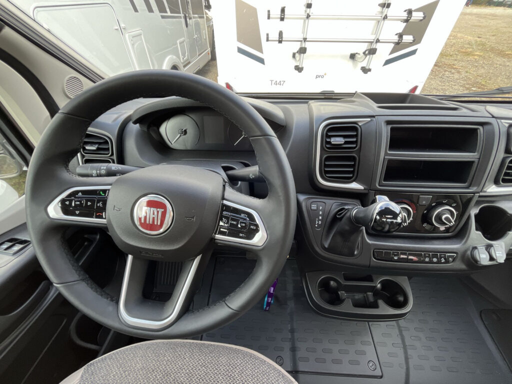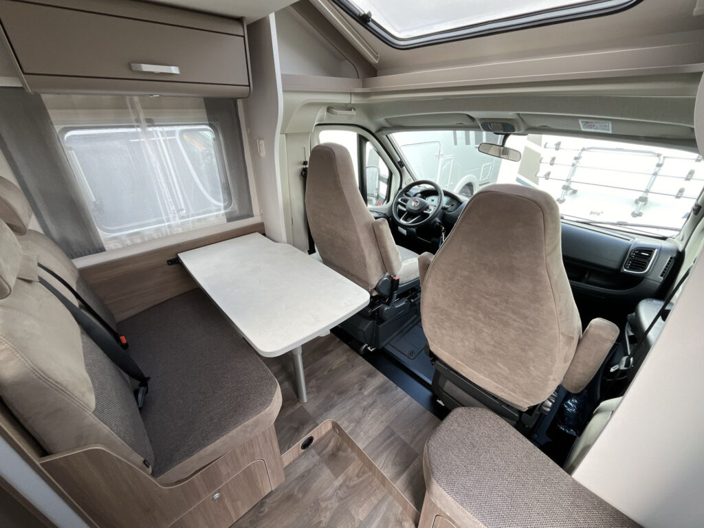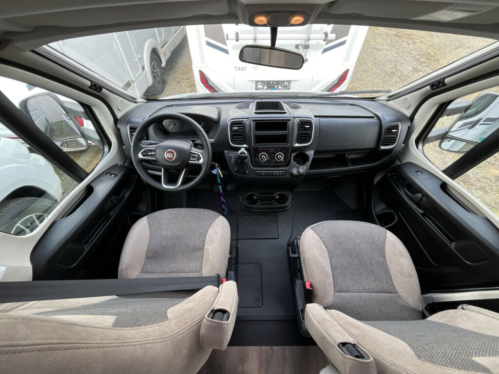 Standardní výbava: Přední otočná sedadla Captain Chair, airbag řidiče a spolujezdce, motorová klimatizace manuální, tónovaná a elektricky ovládaná okna v kabině řidiče, centrální zamykání dveří v kabině řidiče, palubní počítač s ukazatelem vnější teploty, DAB anténa ve zpětném zrcátku, držák na telefon / tablet vč. USB zásuvky, dojezdová sada pro pneu Fix & Go Kit, příprava rádia vč. 4 reproduktorů, přední nárazník v barvě vozidla, 7 let záruka na těsnost nástavby, střecha a zadní stěna odolná proti krupobití, polohovatelná dvojitá boční okna s roletou a sítí proti hmyzu, prostorná garáž se zatížením 150 kg, elektrický vstupní schůdek, LED osvětlení interiéru a exteriéru, výkonná baterie AGM 95 Ah pro obytnou část, kontrolní panel nástavby, vnitřní zásuvky 230V, vnější připojení pro 230V s jističem, USB zásuvka, centrální osvětlení u vstupních dveří, plynové topení Combi 6 s integrovaným 10 l bojlerem, kuchyňská deska s nerezovým dřezem a skleněným krytem, tříhořákový vařič s pojistkou hoření a se skleněným krytem, LED osvětlení nad kuchyňskou linkou, pákové mísící baterie v kuchyni i koupelně, nádrž čisté vody vč. bojleru 122 litrů, odpadní nádrž 92 litrů, WC s elektrickým splachováním, skříňka se zrcadlem, integrované LED osvětlení, střešní okno s ochrannou síťkou, ergonomicky tvarované sedáky, komfortní matrace s odnímatelnými potahy na všech lůžkách, laťový rošt na pevných lůžkách, Isofix pro 2 sedačky