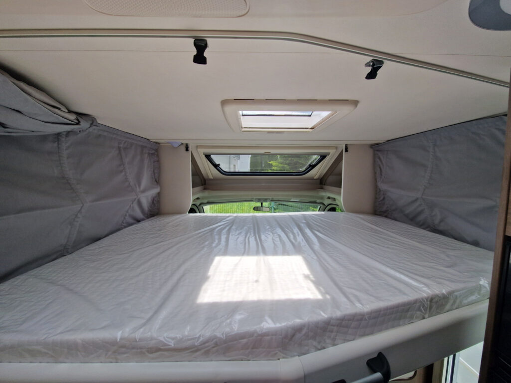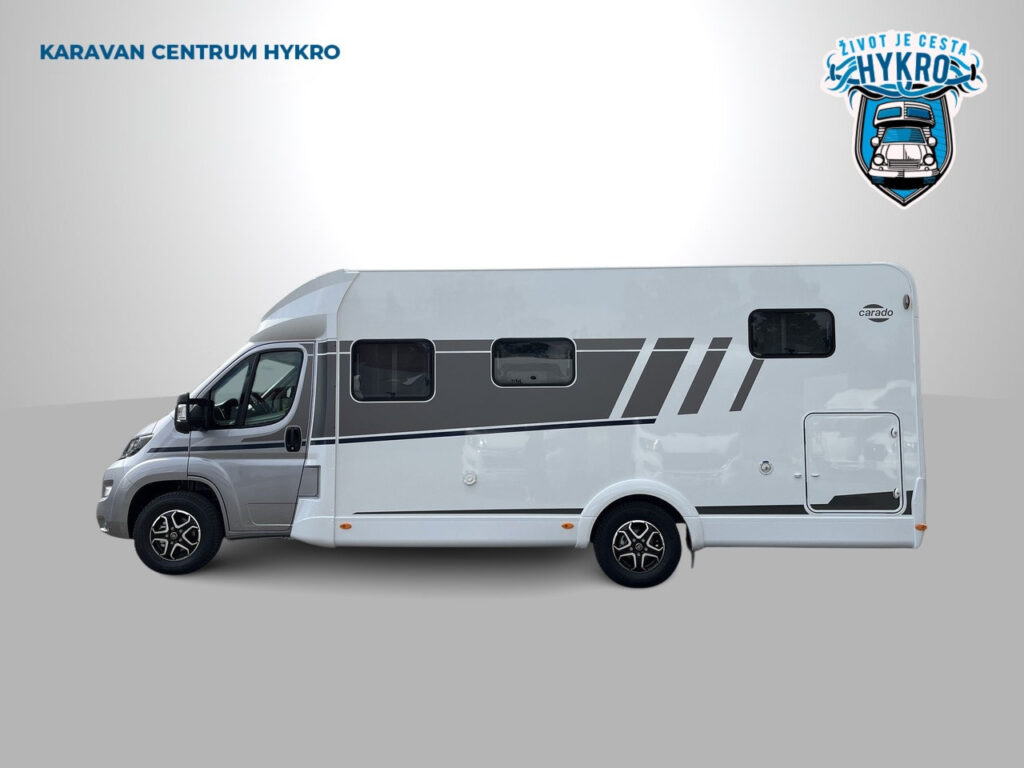 automatická převodovka, 140 PS, Trakce+ vč. asistenta sjezdu z kopce, barva kabiny Artense Grey, 16″ litá kola, polepy Carado Alternativ, přední stahovací lůžko, topení Truma Combi 6E