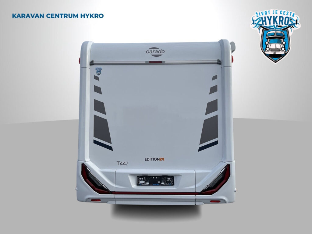 PROVEDENÍ EDITION24 ZAHRNUJE TUTO VÝBAVU: barva podvozku Chroma-Blue, 16″ litá kola, polepy Carado Alternativ, plynové topení Truma Combi 6, druhé garážové dveře 80×85 cm, izolovaná odpadní nádrž, markýza 4.5 m, zatemňovací žaluzie v kabině řidiče, velká lednice 156 l s odděleným mrazákem 29 l, okno na toaletě, rámová okna, interiér obytné části v šedé barvě, designové polepy Edition24