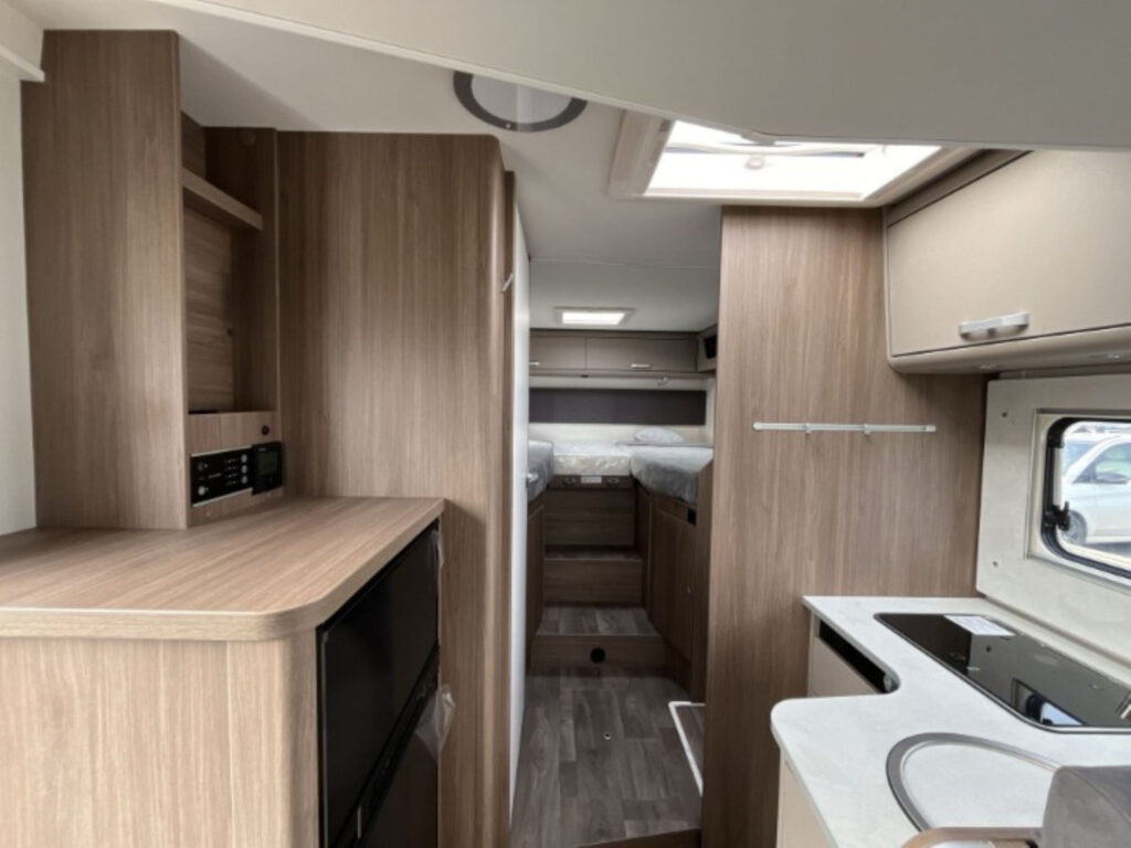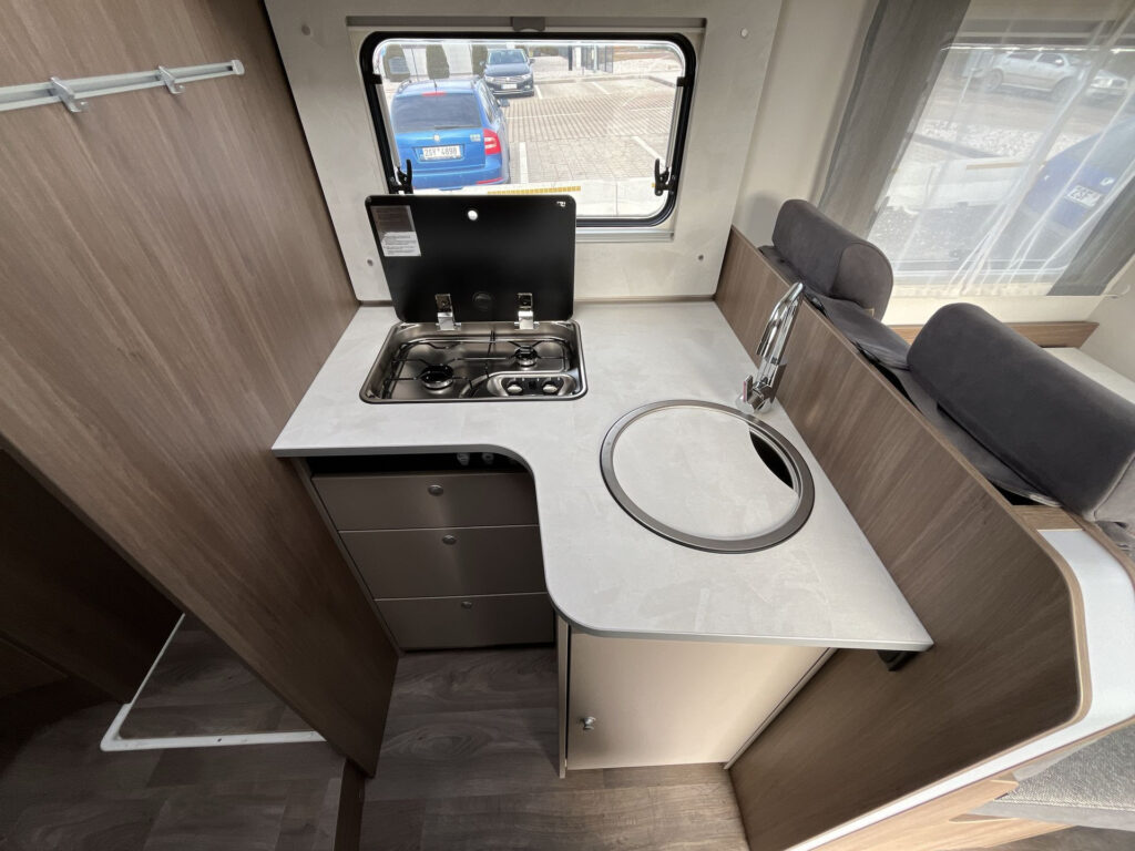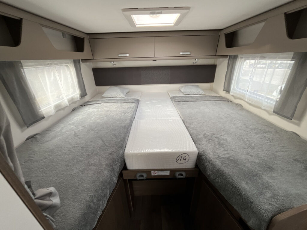 Příplatková výbava v ceně vozu: výsuvný rošt mezi zadními lůžky, sezení rozložitelné na 5. lůžko, 5. místo na jízdu, přední stahovací dvojlůžko, dřevěný rošt do sprchy, topení Truma Combi 6E