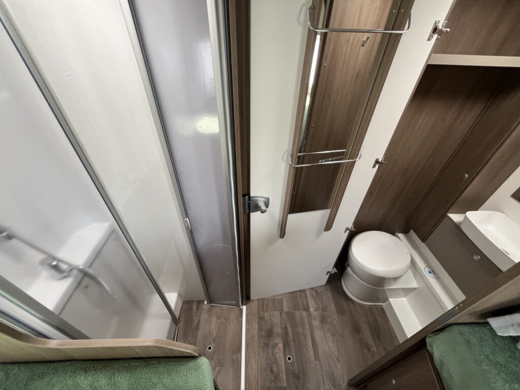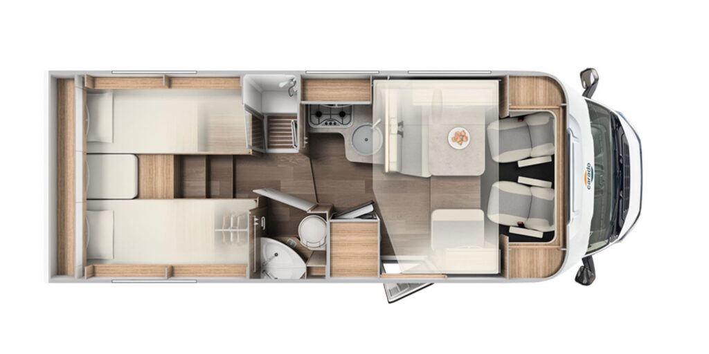 automatická převodovka, 140 PS, automatická klimatizace kabiny řidiče, multifunkční volant, elektrické podlahové topení, barva kabiny Artense Grey, 16″ litá kola, polepy Carado Alternativ, výsuv mezi zadními lůžky, přední stahovací lůžko, dřevěný rošt ve sprše, příprava pro TV vč. držáku (12V), topení Truma Combi 6E