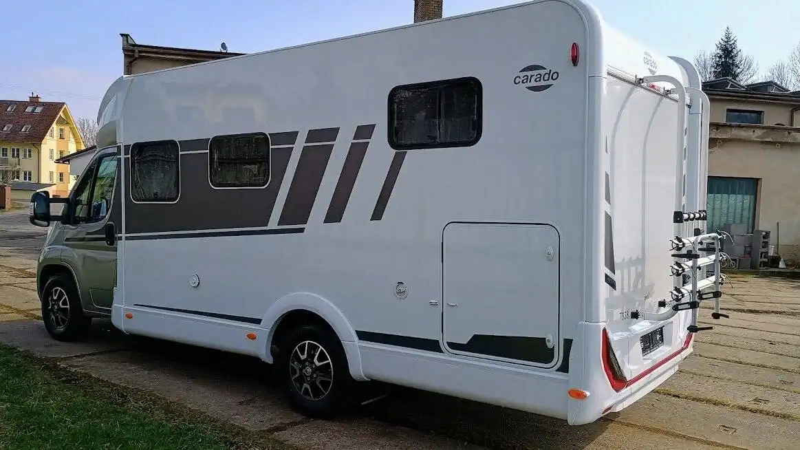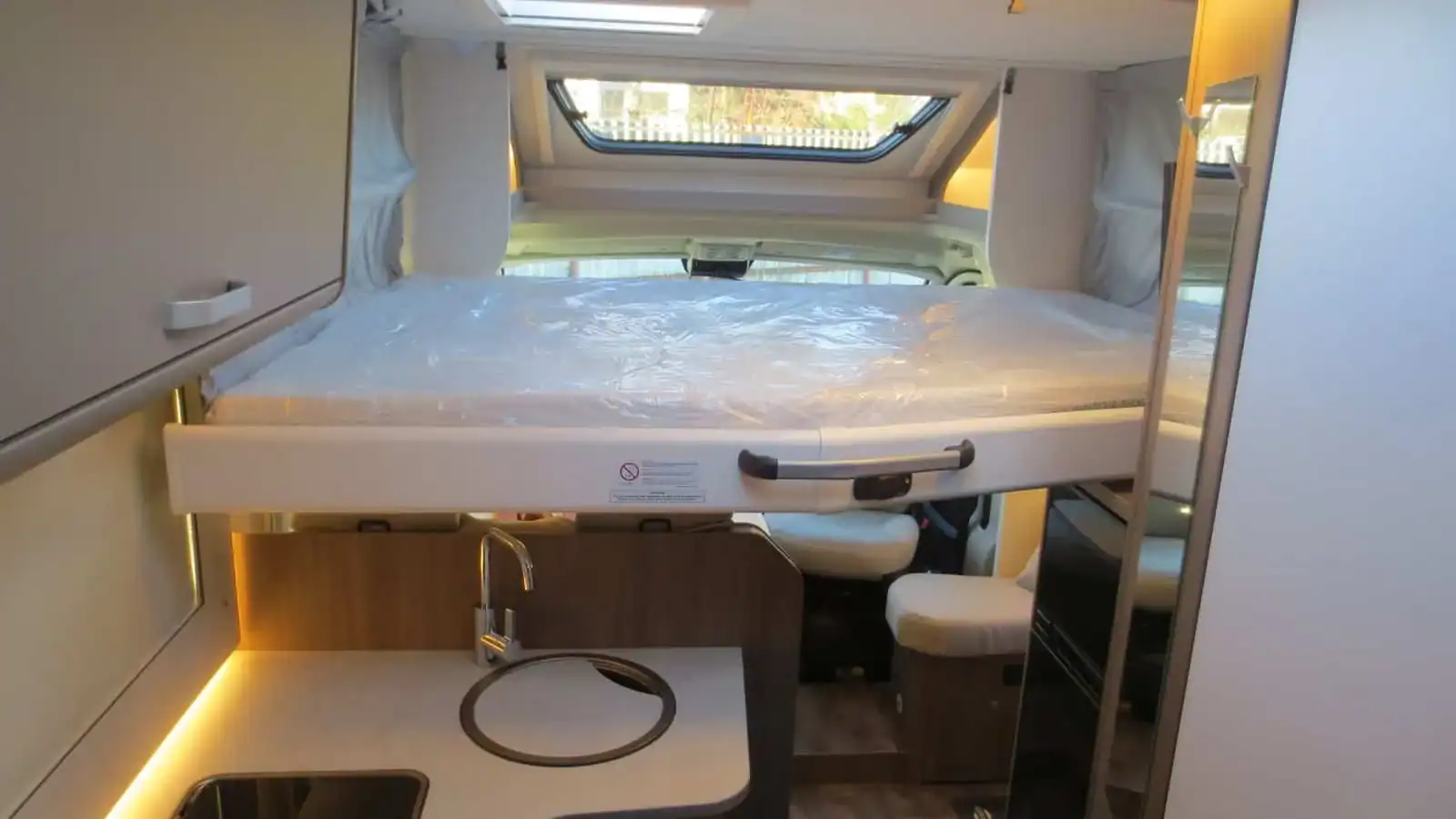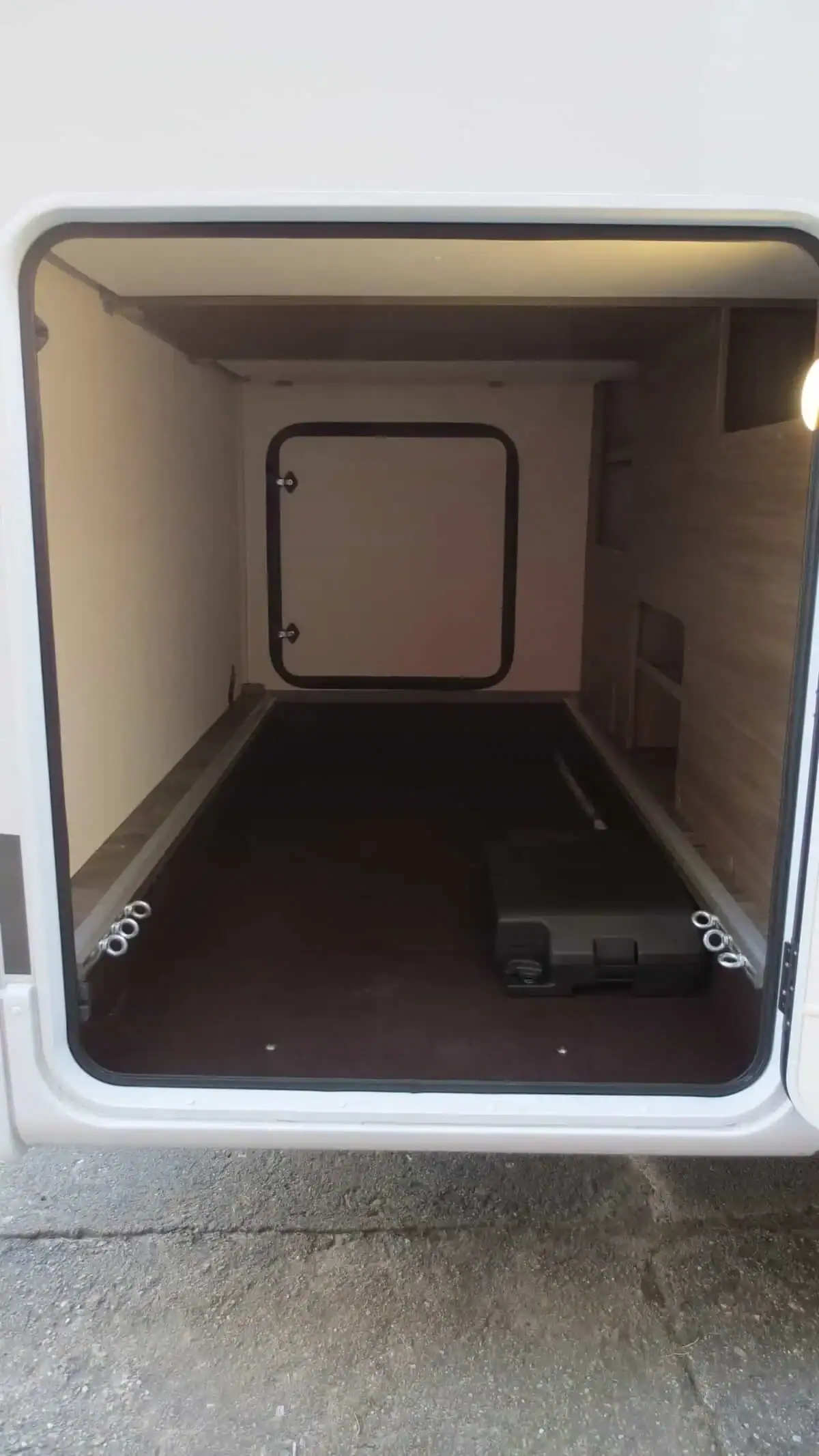 * Velká garáž (vytápěná), odkládací prostory v garáži, nosič jízdních kol, v zadní části oddělené spaní s možností propojení, velká koupelna s chemickým WC a odděleným sprchovým koutem, velká trojkombinační lednice 156l + mrazák 29l, kuchyňský kout s dřezem a plynovým vařičem. Ambientní LED osvětlení + venkovní LED osvětlení. Spouštěcí lůžko pro dvě osoby v přední části.