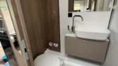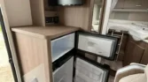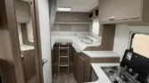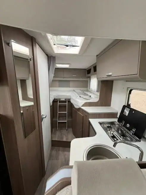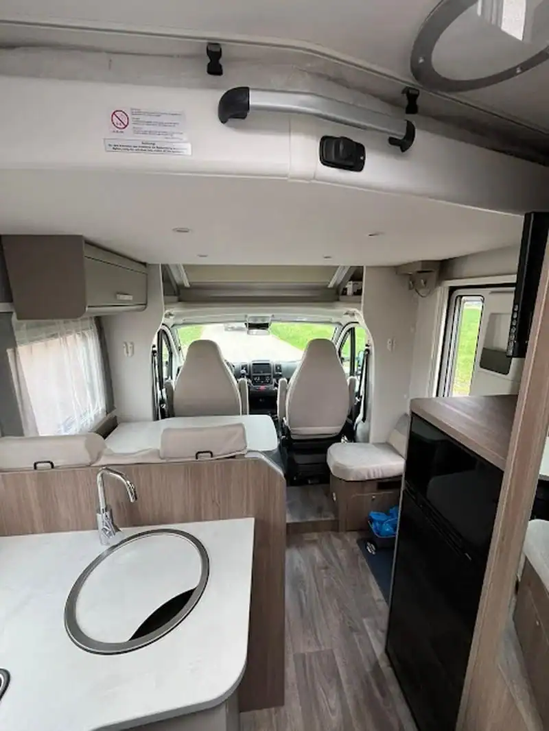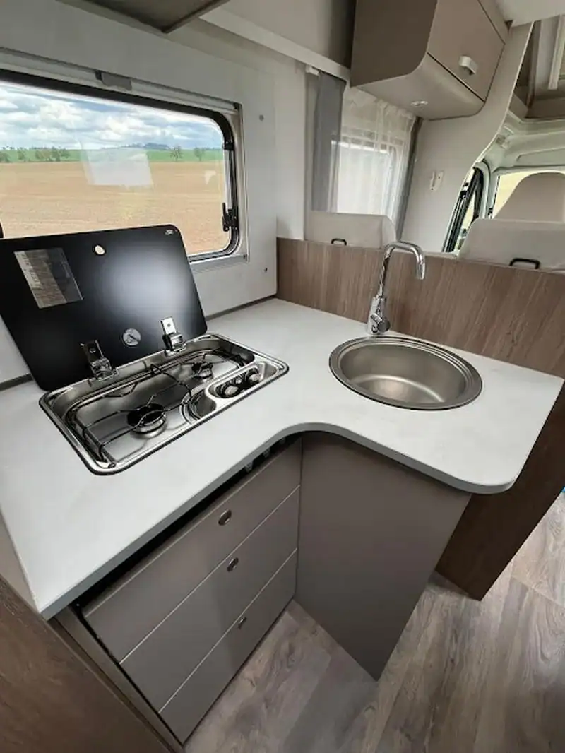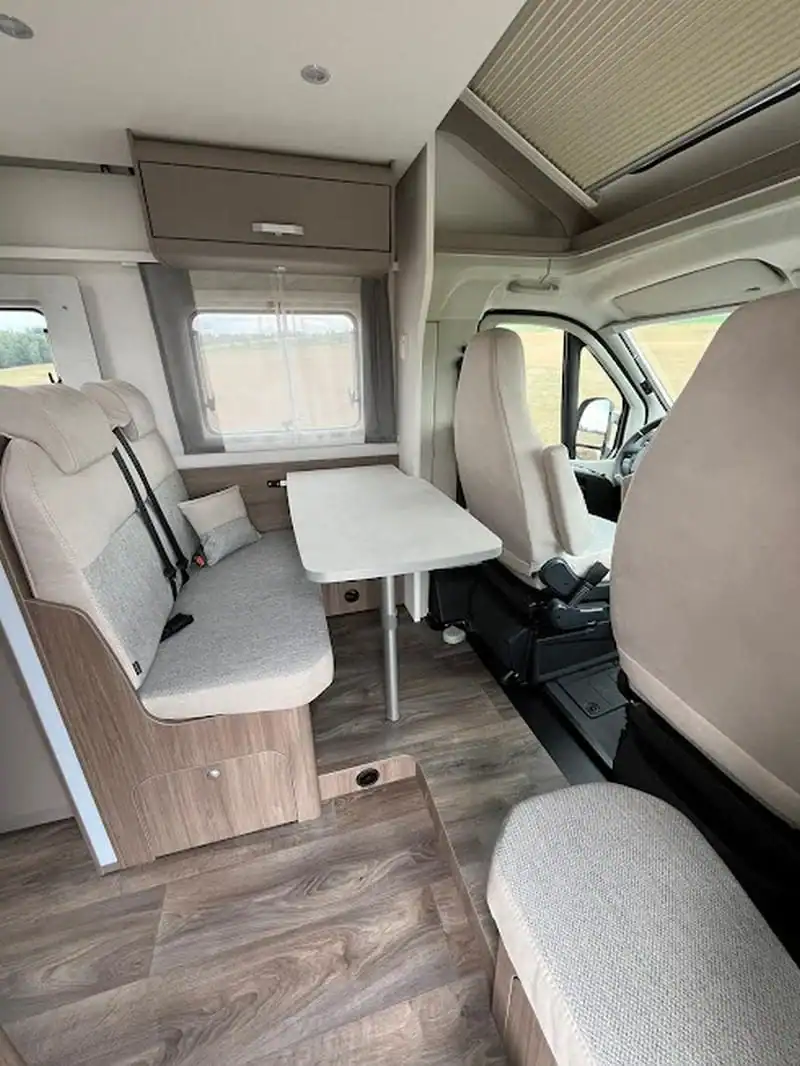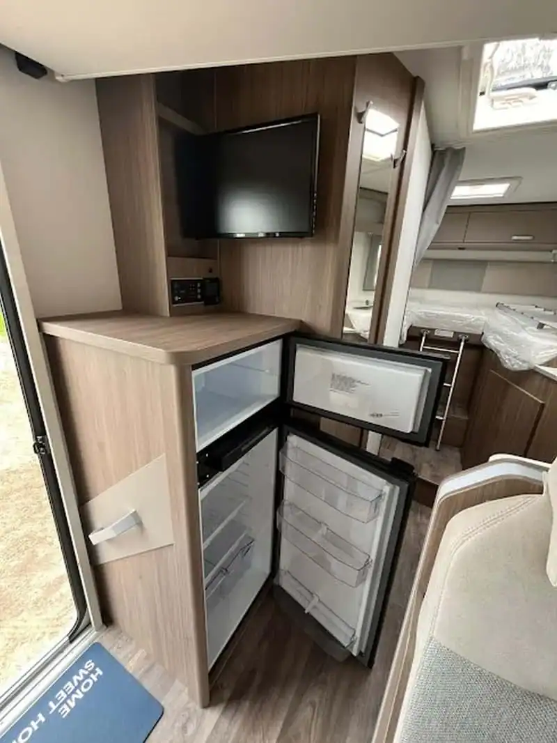 * Velká garáž (vytápěná), odkládací prostory v garáži, nosič jízdních kol, v zadní části oddělené spaní s možností propojení, velká koupelna s chemickým WC a odděleným sprchovým koutem, velká trojkombinační lednice 156l + mrazák 29l, kuchyňský kout s dřezem a plynovým vařičem. Ambientní LED osvětlení + venkovní LED osvětlení. Spouštěcí lůžko pro dvě osoby v přední části.