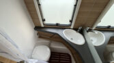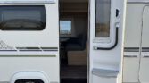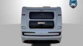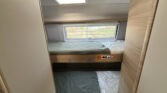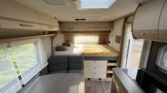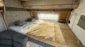 Luxusní karavan se zvýšeným dvoulůžkem v přední části a palandami v zadní části karavanu.