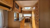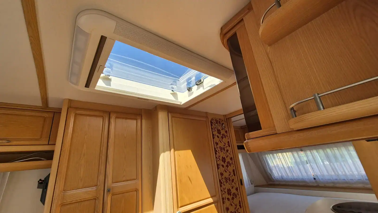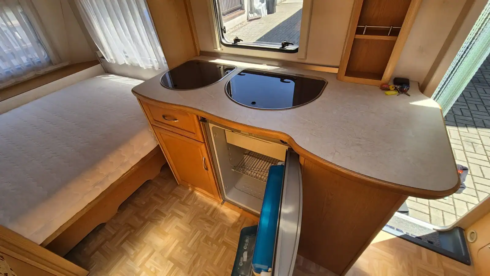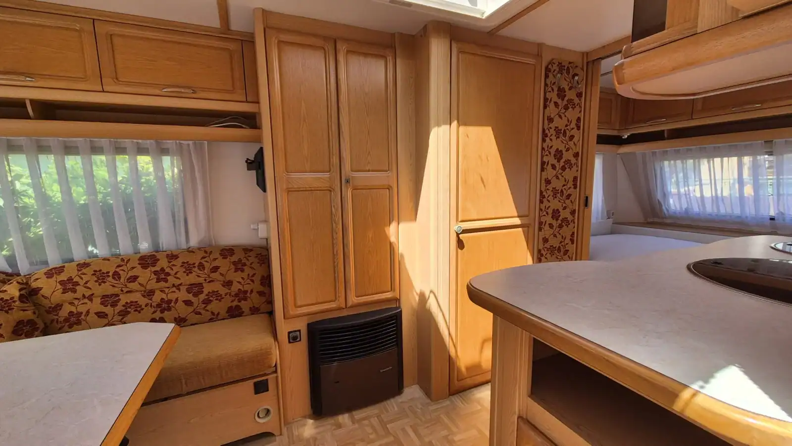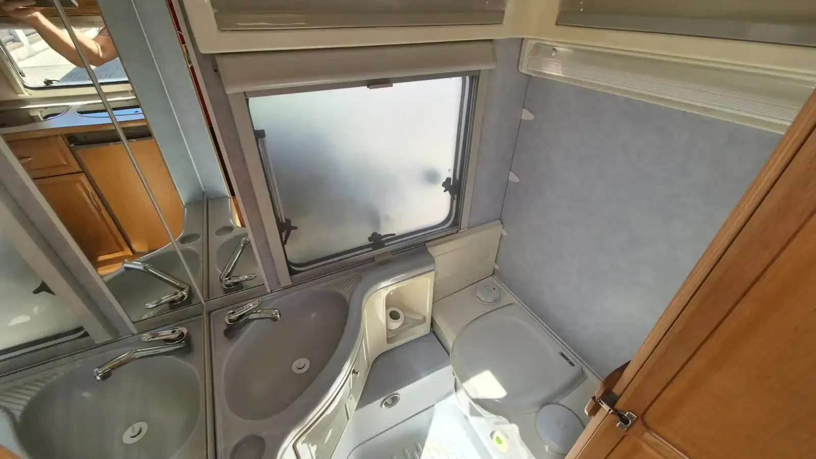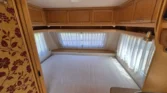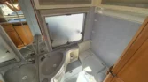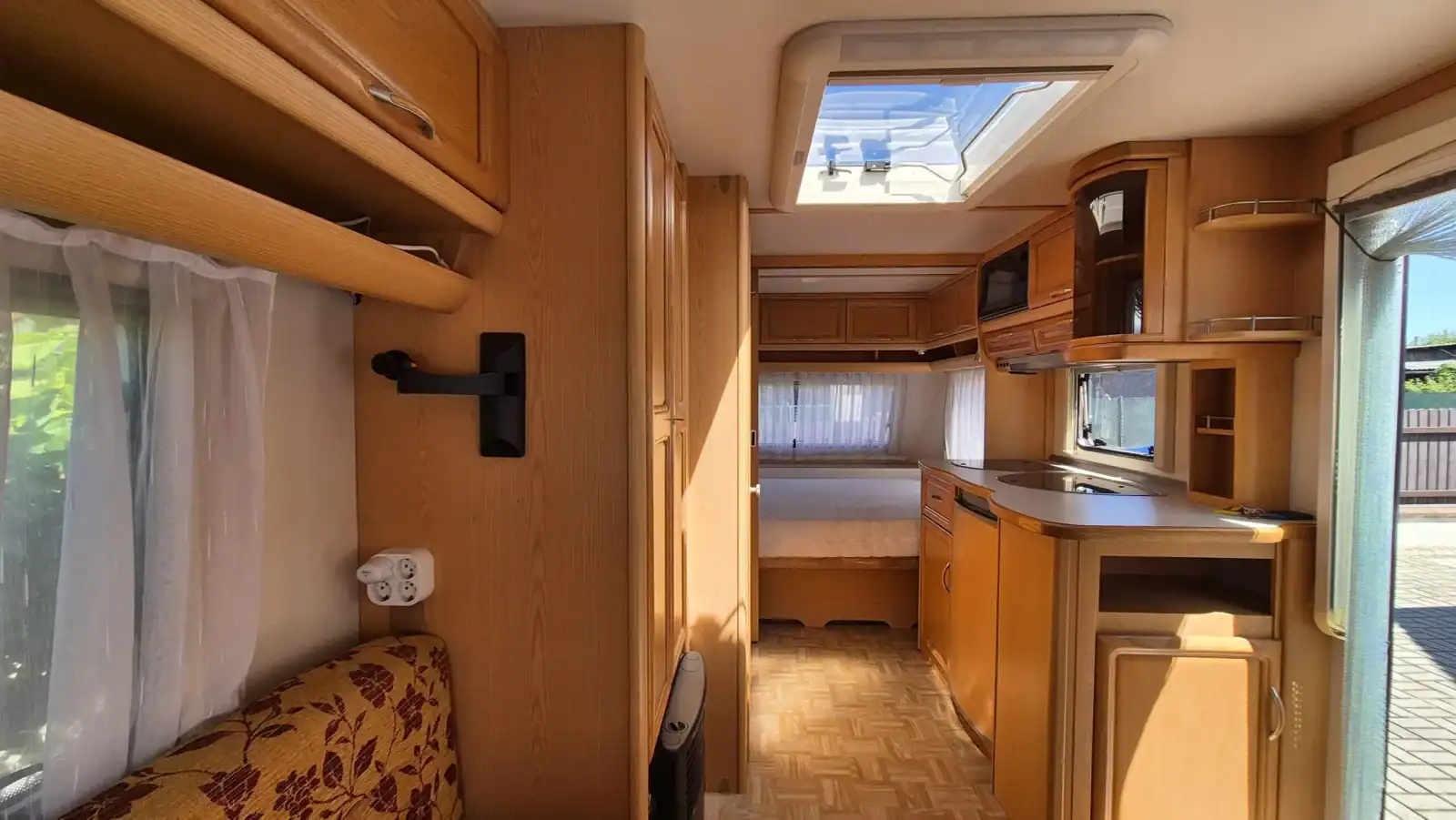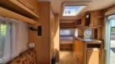 Uprostřed vlevo je koupelna s kazetovým wc a plastovou podlahou s výpustí. Kuchyňský sektor s lednicí 12V/230V/plyn, plynovým sporákem, mikrovlnnou troubou a dřezem je uprostřed vpravo. Karavan má termorolety, síťky proti hmyzu ve všech oknech, velké panoramatické stropní…