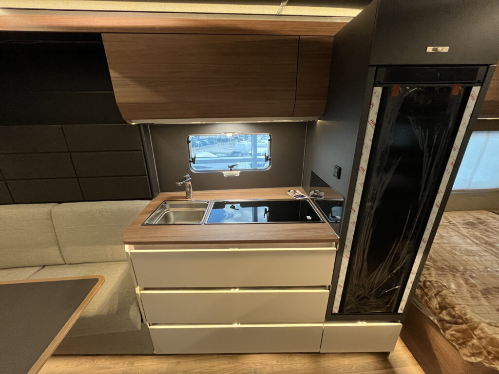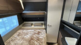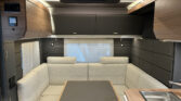 Obytná část: skříňky a úložné prostory s odvětráním, uzavírání skříněk s funkcí soft-close, dekor nábytku Samoa Dark, vinylová podlaha v dekoru Midland Oak, textilový oddělovač u ložnice s magnetickým zapínáním, obložení stěny nad postelí, látkový potah stropu, matrace EvoPore HRC na pevných lůžkách, čalounění Elegant Silver