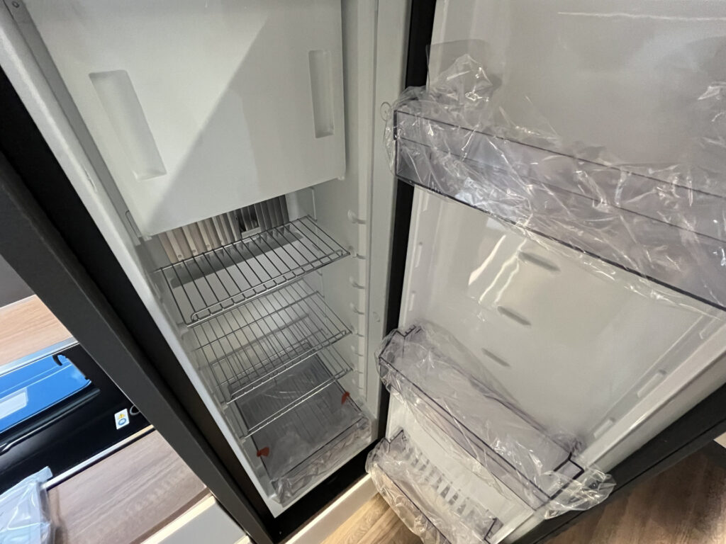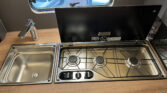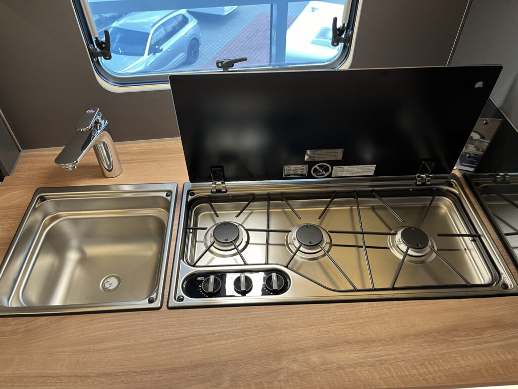 Kuchyňka a koupelna: tříhořákový plynový vařič s elektrickým zapalováním, litinovým roštem a skleněným krytem, rozkládací pracovní deska kuchyňky, lednice 133 l se systémem AES, lavicové WC Thetford, věšák na oblečení, umyvadlo Knaus