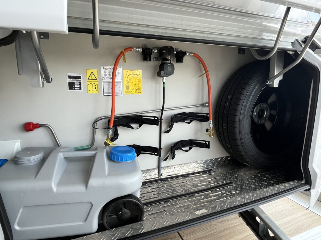 Topení / klimatizace / plyn / voda: plynový systém 30 mbar, plynová hadice, nádrž čisté vody s ponorným čerpadlem, přívod teplé vody jednopákovou směšovací baterií, odpadní potrubí s jedním vnějším odtokem, nádrž na čistou vodu 45 l, vodní filtr „bluuwater“, ukazatel stavu vody