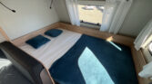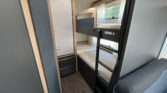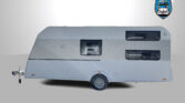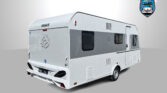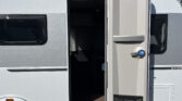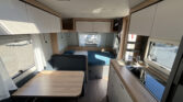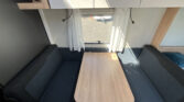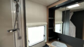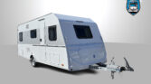 Rodinný karavan s příčným lůžkem, palandami a koupelnou s odděleným sprchovým koutem skladem.