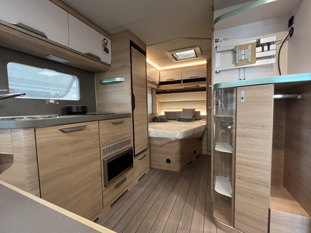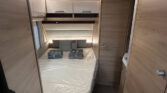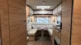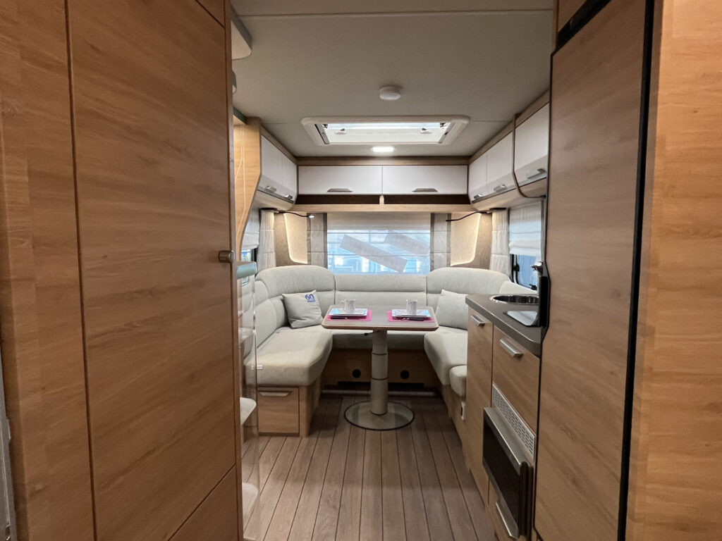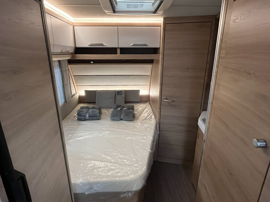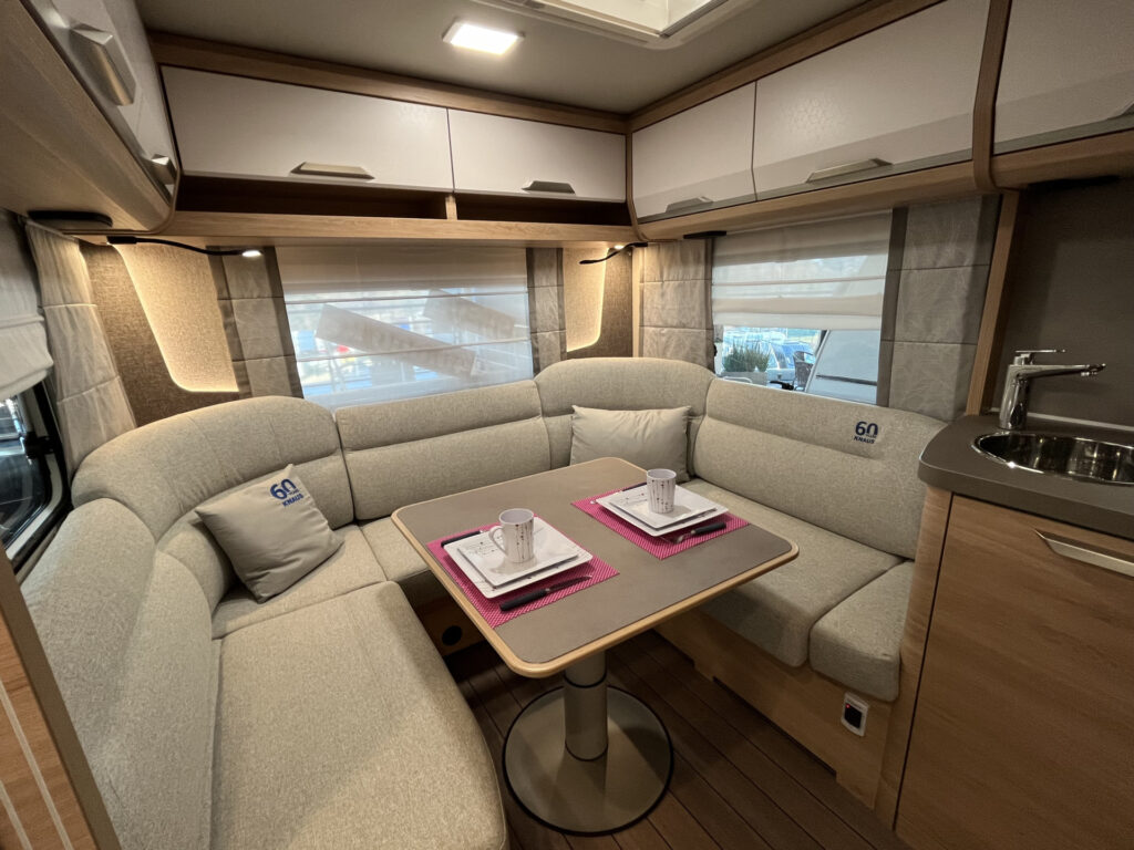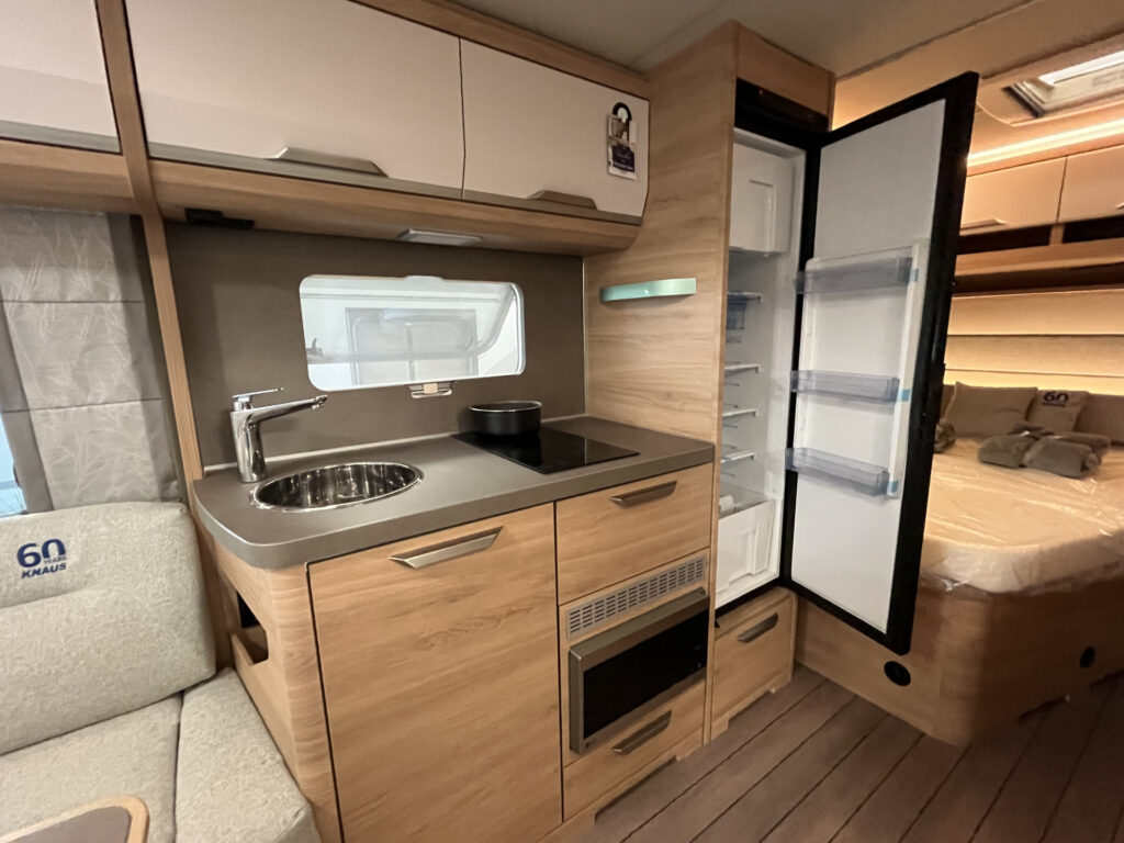 OBYTNÝ PROSTOR: skříňky a police s odvětráním, zavírání skříněk s funkcí soft-close, dekor nábytku Modern Oak, vinylová podlaha, rozdělovací látkový paravan, matrace EvoPore HRC na pevných lůžkách, čalounění Casual Silver s dekorem „Knaus 60 Years“, COZY HOME PAKET (2 dekorativní polštáře, 2 polštáře na spaní, 2 deky)
