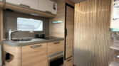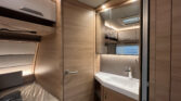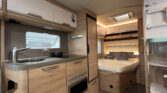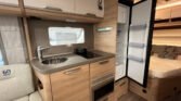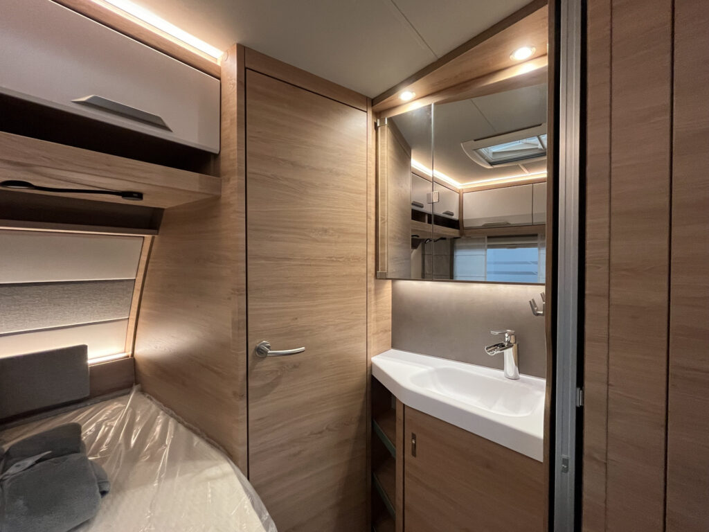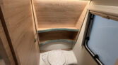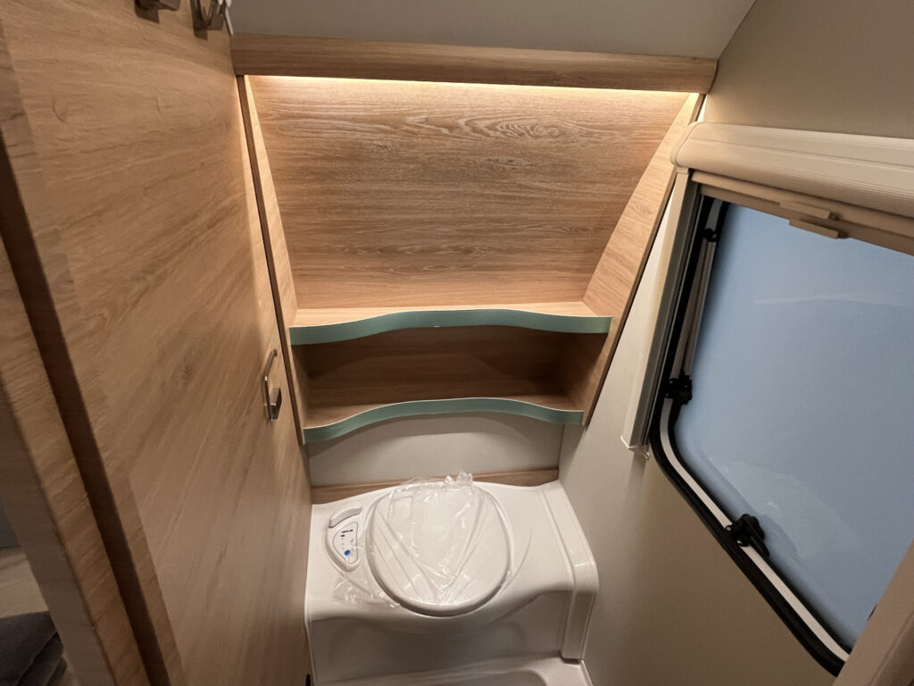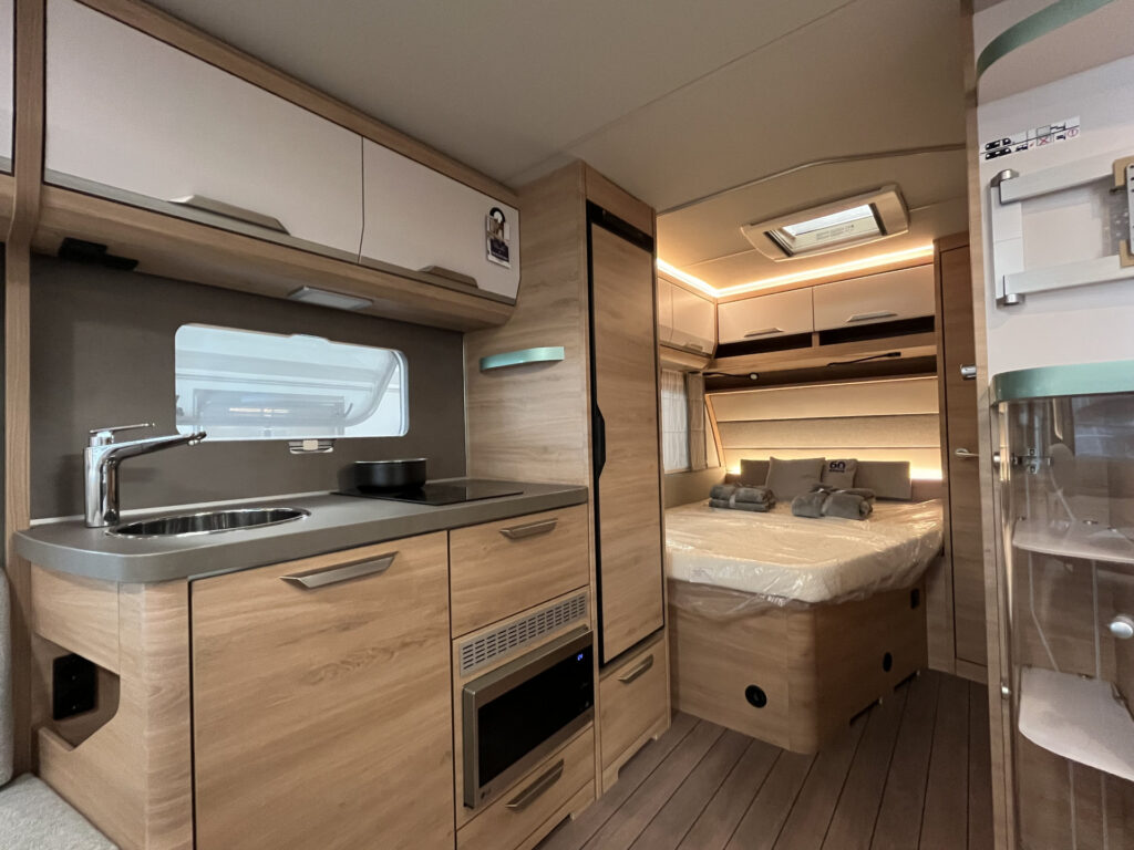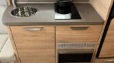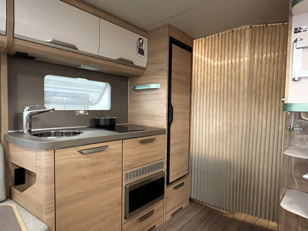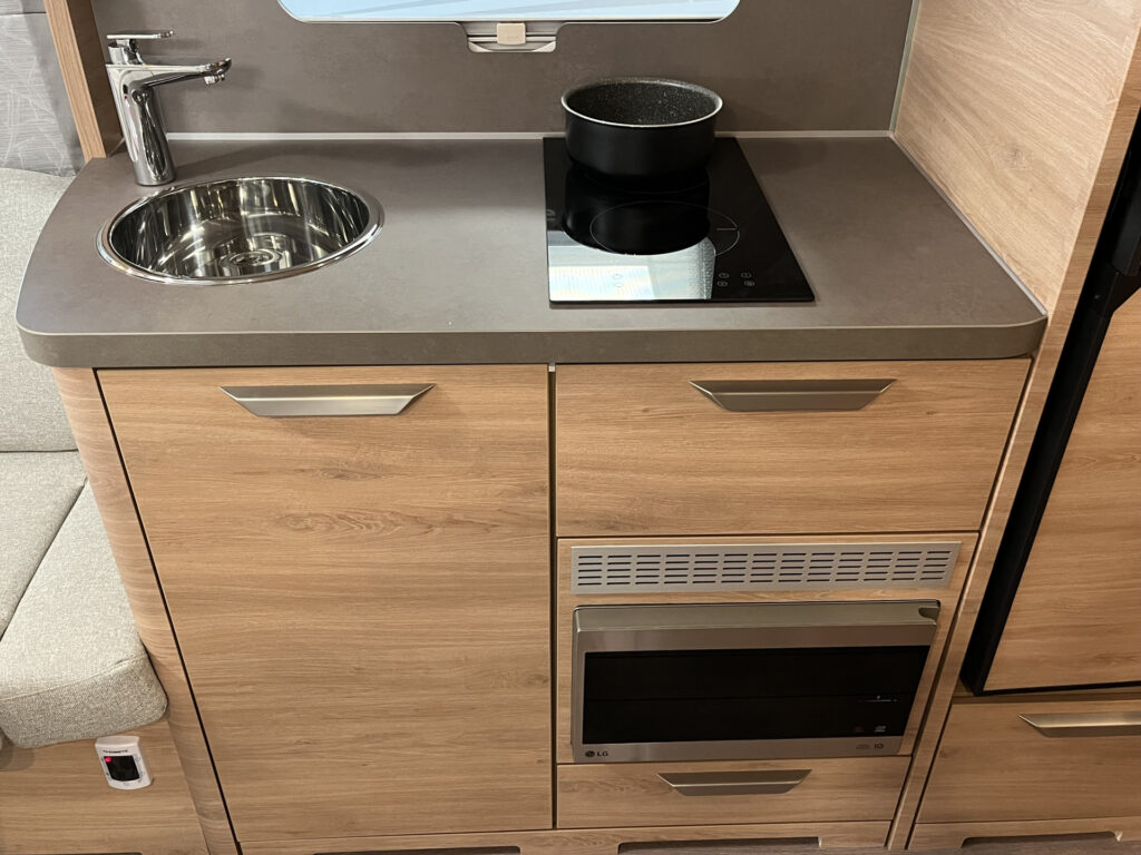 KUCHYŇKA A KOUPELNA: dvouplotýnková indukční varná deska se skleněným krytem vč. nerezového dřezu, kompresorová lednice 98 l se systémem AES, otočná kazetová toaleta Dometic
