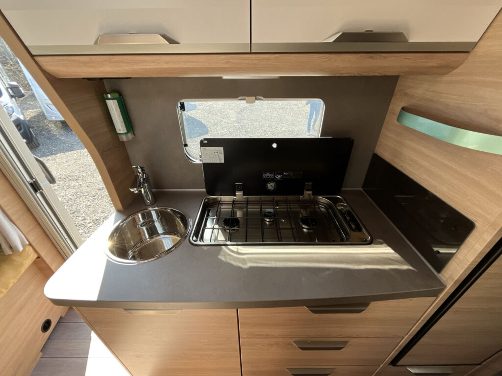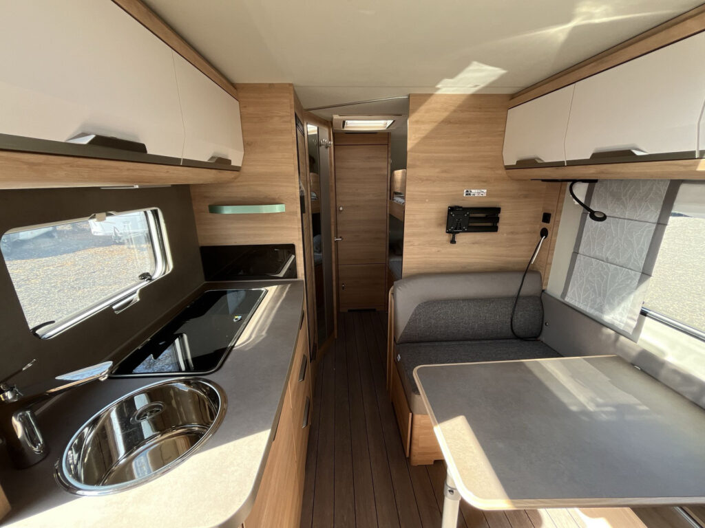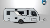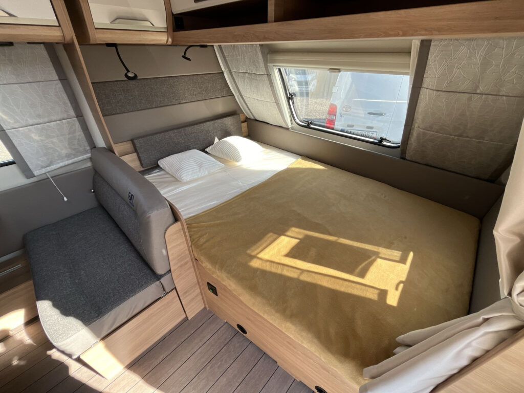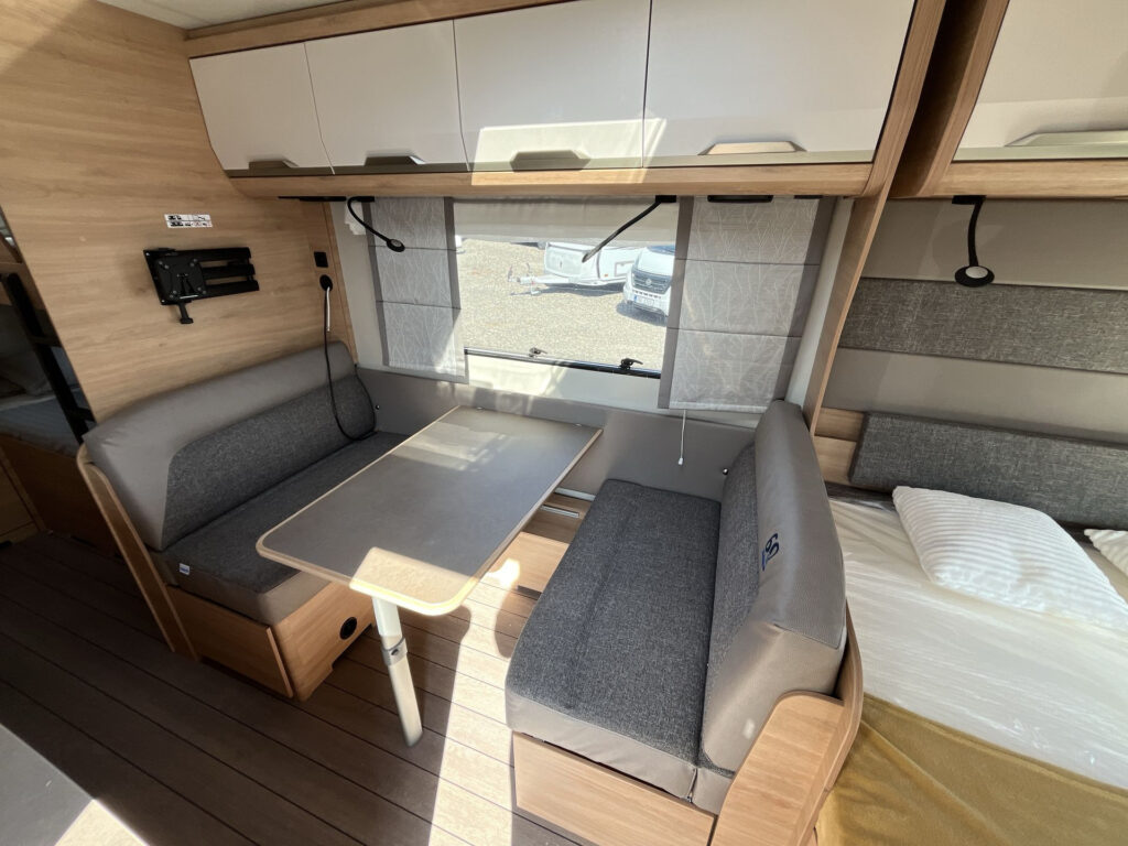 Další příplatková výbava v ceně: lité rezervní kolo vč. zvedáku a držáku na podvozku, digitální ovládací panel k topení Truma CP Plus, rozšíření pracovní desky v kuchyňce, rozšíření sedací soupravy (vč. možnosti rozložení na dvojlůžko)