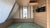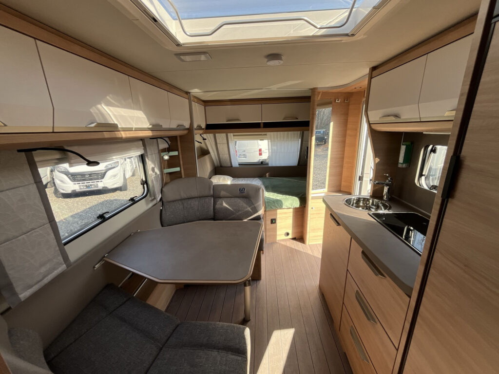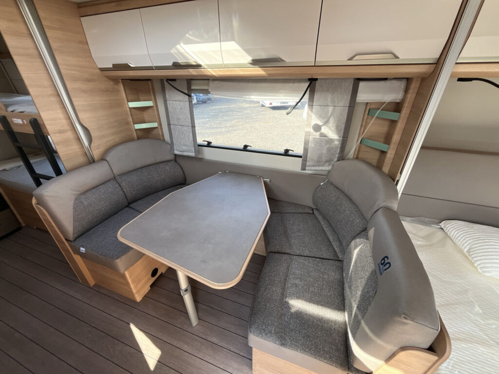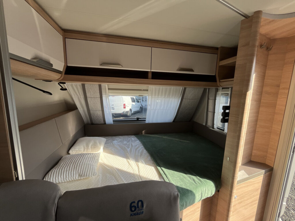OBYTNÝ PROSTOR: skříňky a police s odvětráním, zavírání skříněk s funkcí soft-close, dekor nábytku Modern Oak, vinylová podlaha, rozdělovací látkový paravan, matrace EvoPore HRC na pevných lůžkách, dvojitá palanda, čalounění Casual Silver s dekorem „Knaus 60 Years“, COZY HOME PAKET (2 dekorativní polštáře, 2 polštáře na spaní, 2 deky)