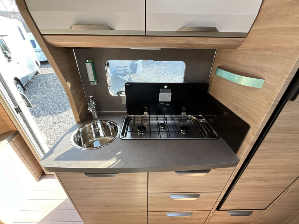 Příplatková výbava v ceně karavanu: držák rezervního kola v prostoru na plynové láhve, lité rezervní kolo 17″, rozšíření pracovní desky v kuchyňce