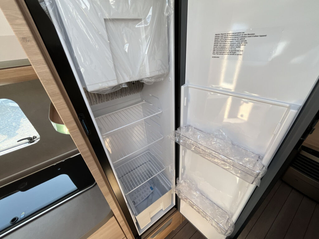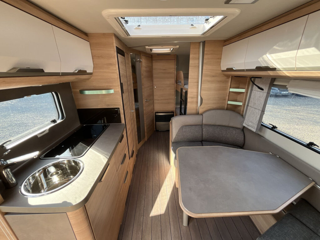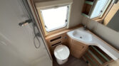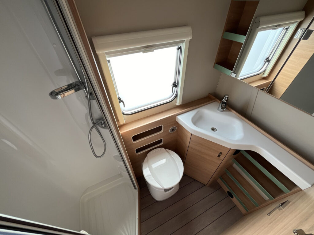 KUCHYŇKA A KOUPELNA: tříhořákový vařič s elektrickým zapalováním a skleněným krytem vč. nerezového dřezu, lednice 142 l se systémem AES, otočná kazetová toaleta Dometic, komfortní koupelna