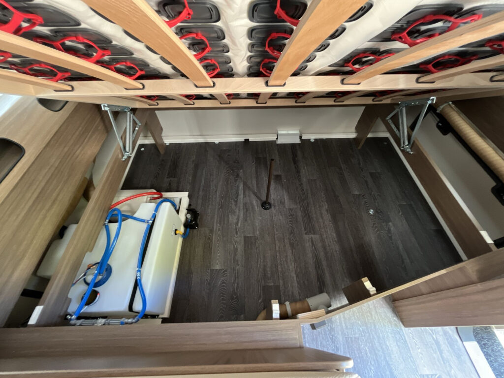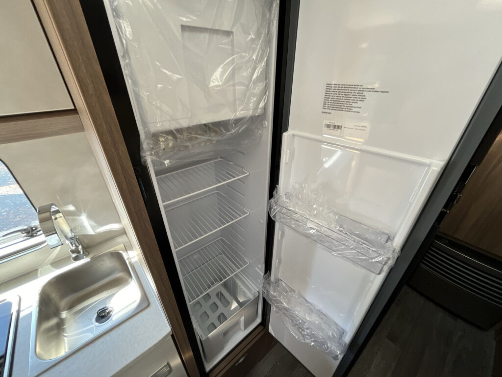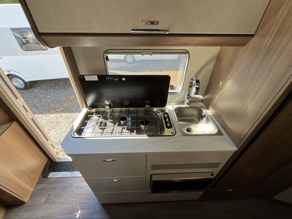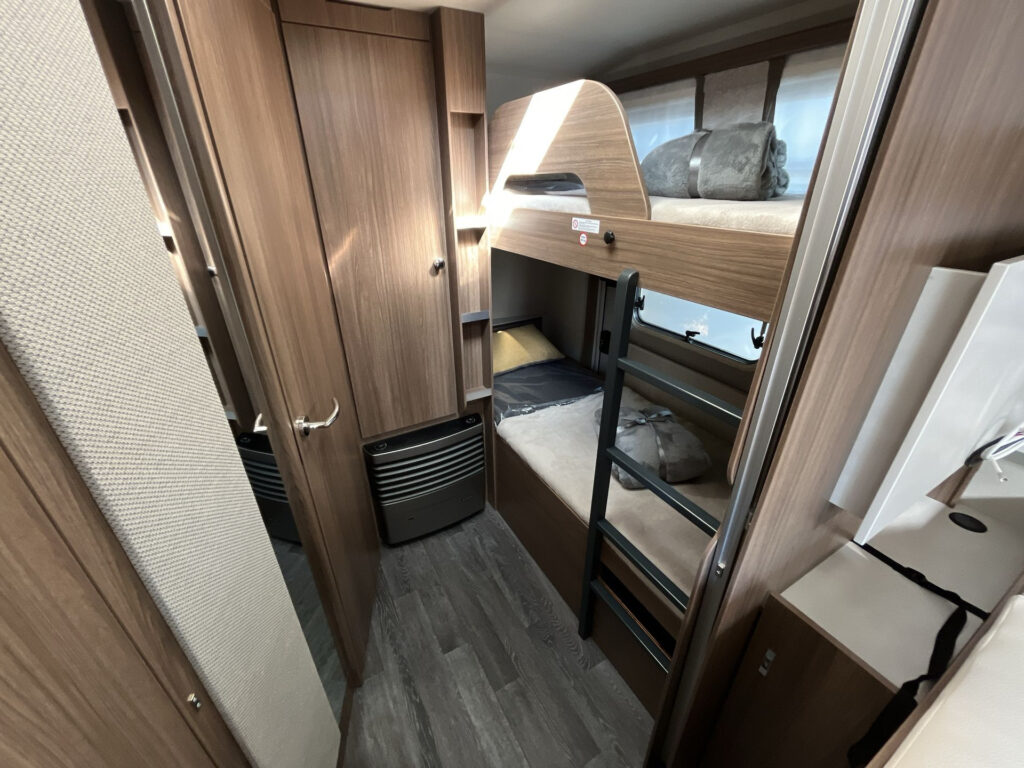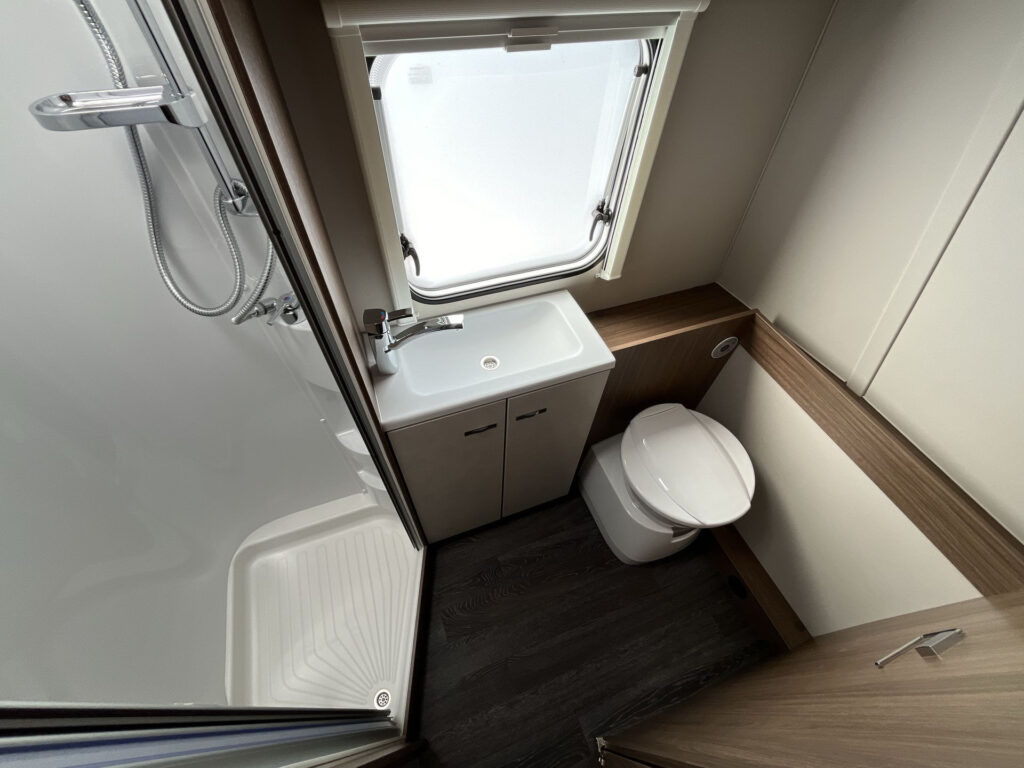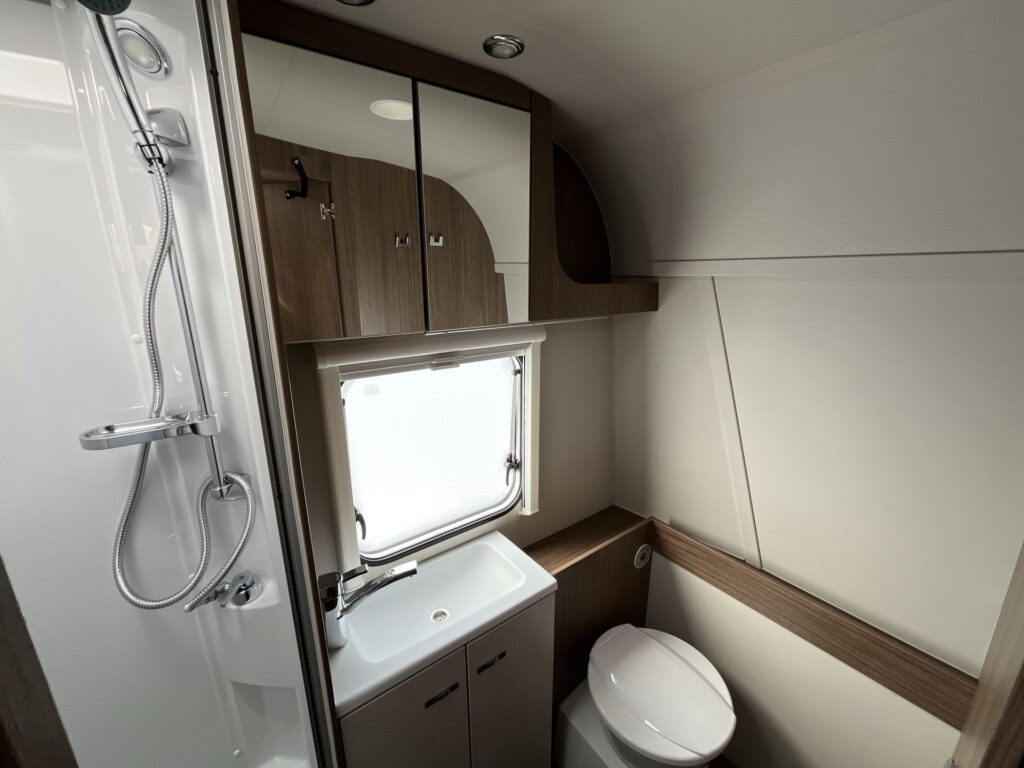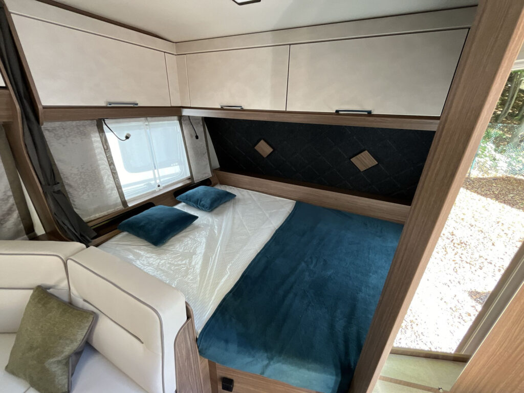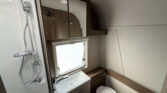 Příplatková výbava v ceně karavanu: světelná lišta na boční straně, navýšení celkové hmotnosti na 1 800 kg, ocelové rezervní kolo 15", mikrovlnná trouba, oddělený sprchový kout s plastovými stěnami a skládacími dveřmi, sklápěcí spodní lůžko palandy (větší úložný prostor) + garážové dveře a okno s kombinovanou roletkou