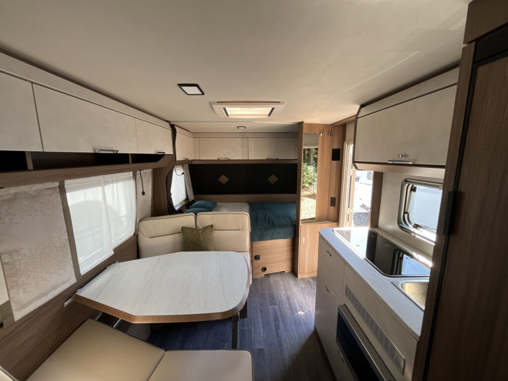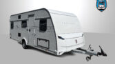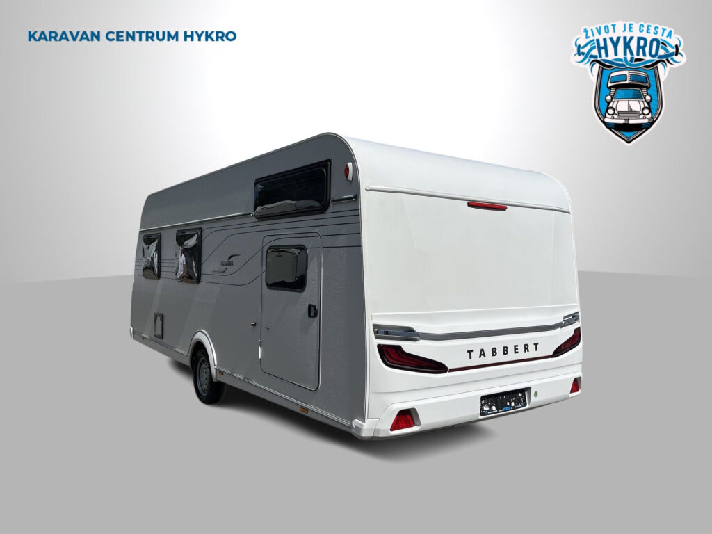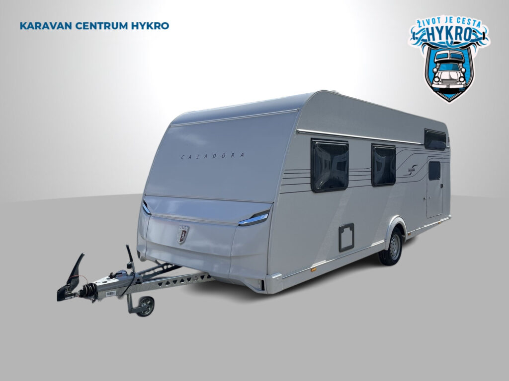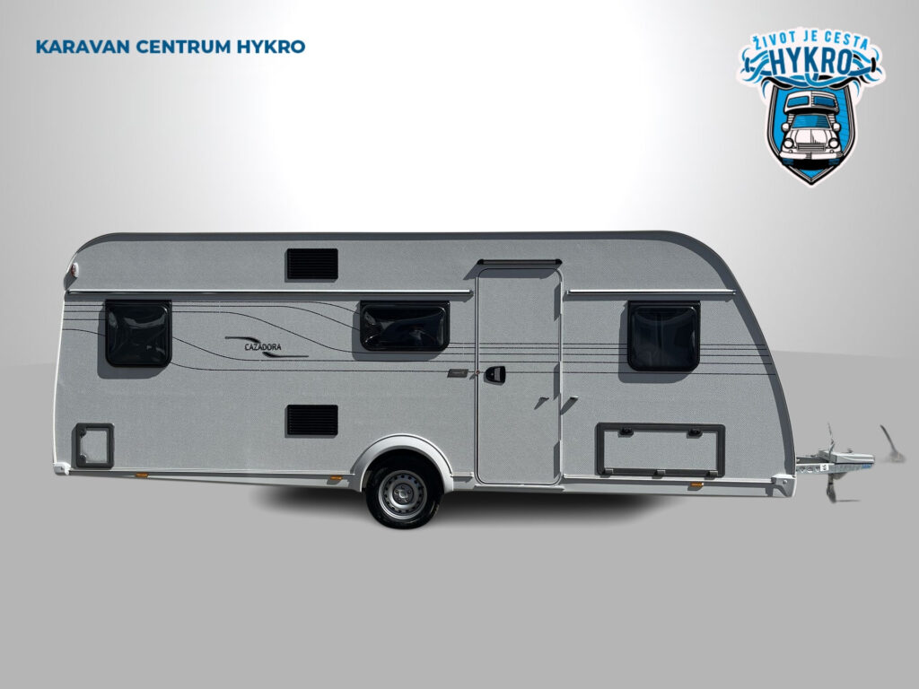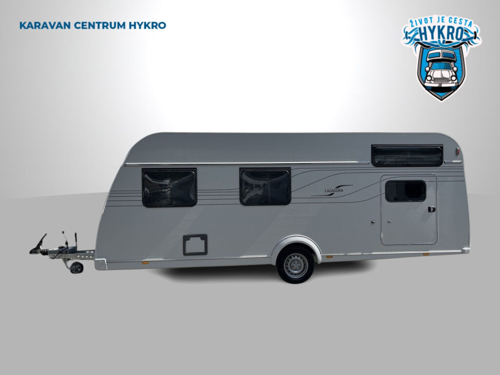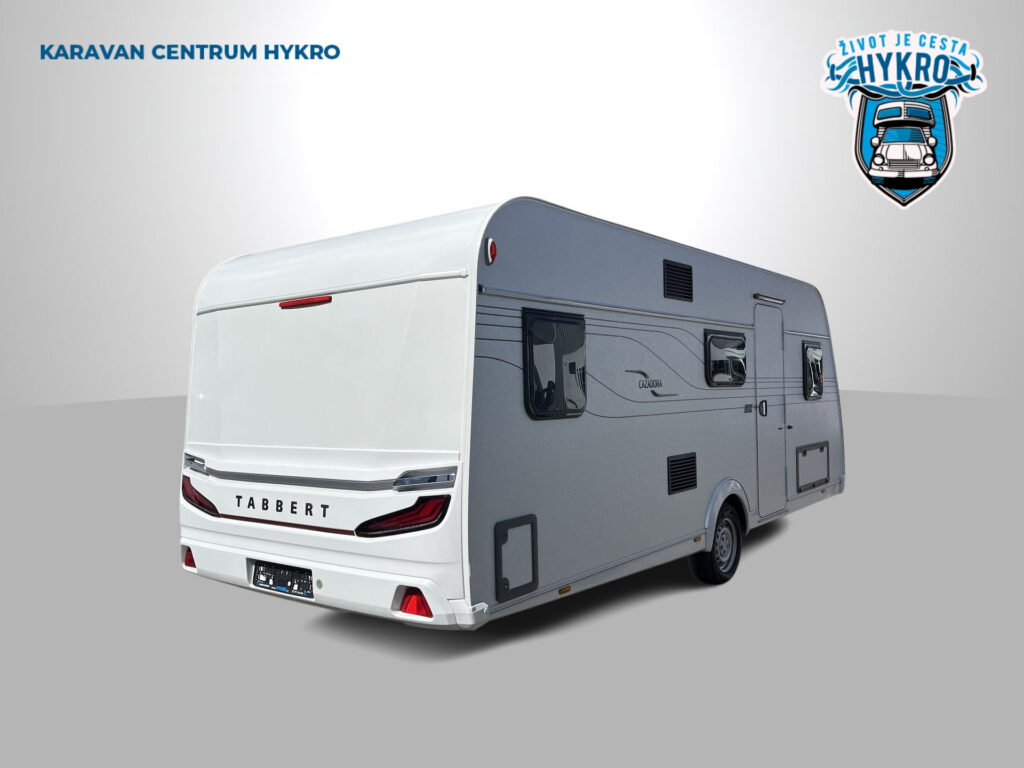 Skladem - rodinný přívěs Tabbert Cazadora 550 DMK s příčným dvojlůžkem, palandami a rozkládací sedací soupravou. Fotografie jsou pouze ilustrační!