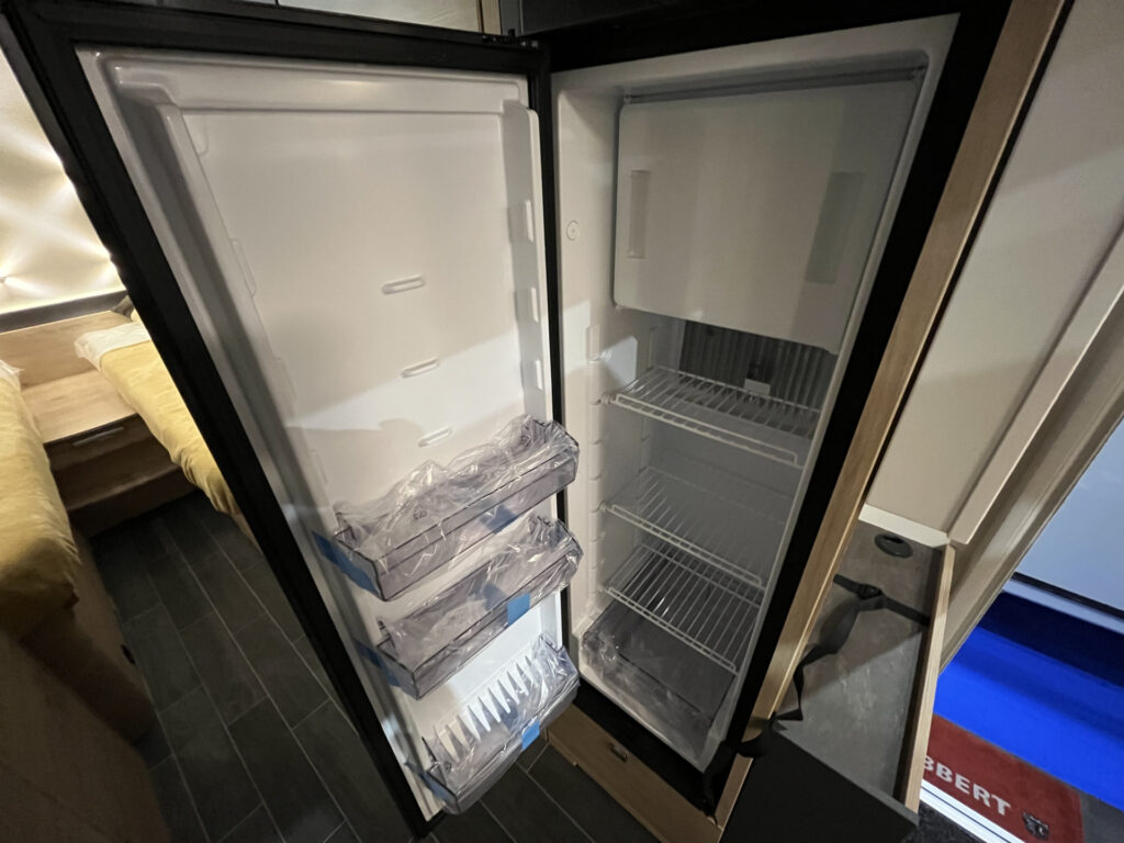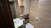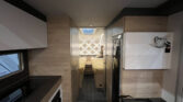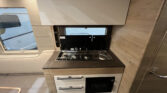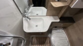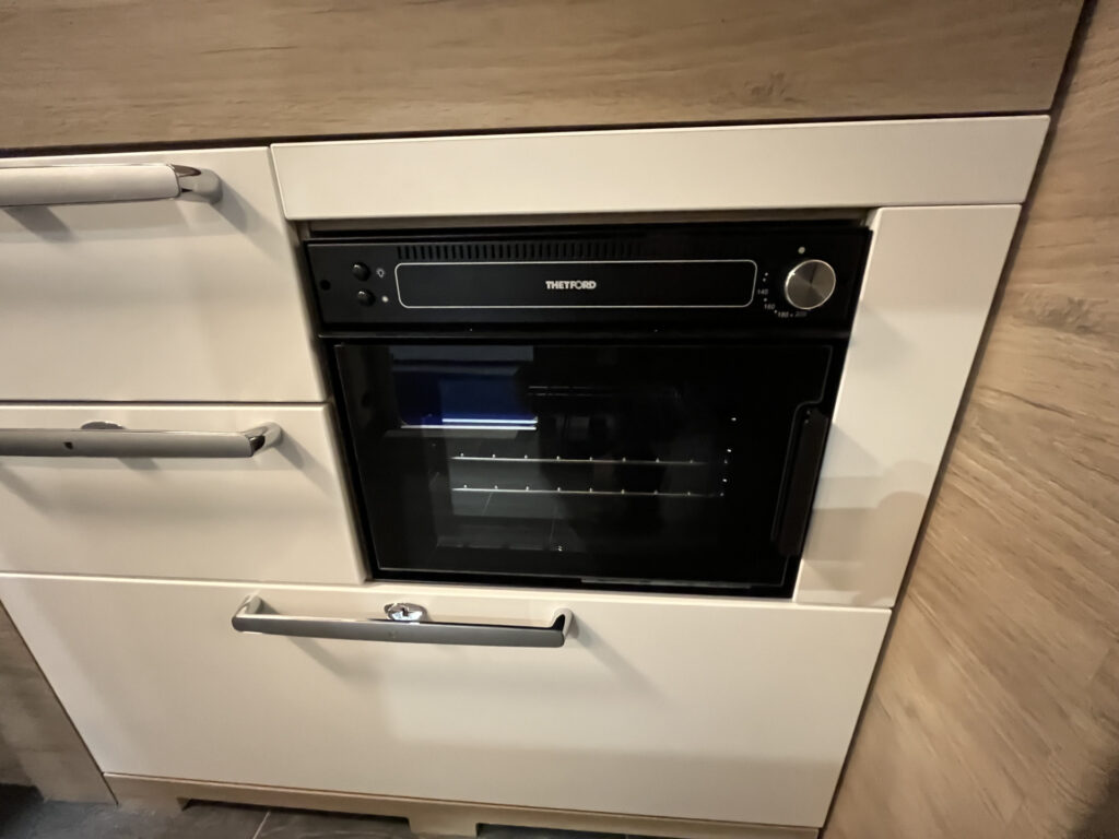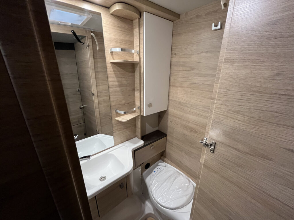 KUCHYŇKA A KOUPELNA: přenosná indukční dvouplotýnka, lednice 133 l se systémem AES (podle modelu), nerezový dřez se skleněným krytem, skříňky s funkcí soft-close, komoda v koupelně se zrcadlem a poličkami, lavicové WC Thetford, utěsněná záchodová šachta