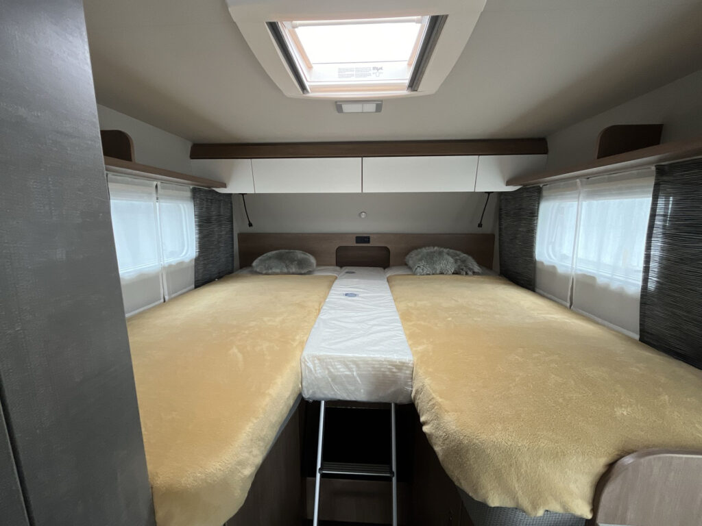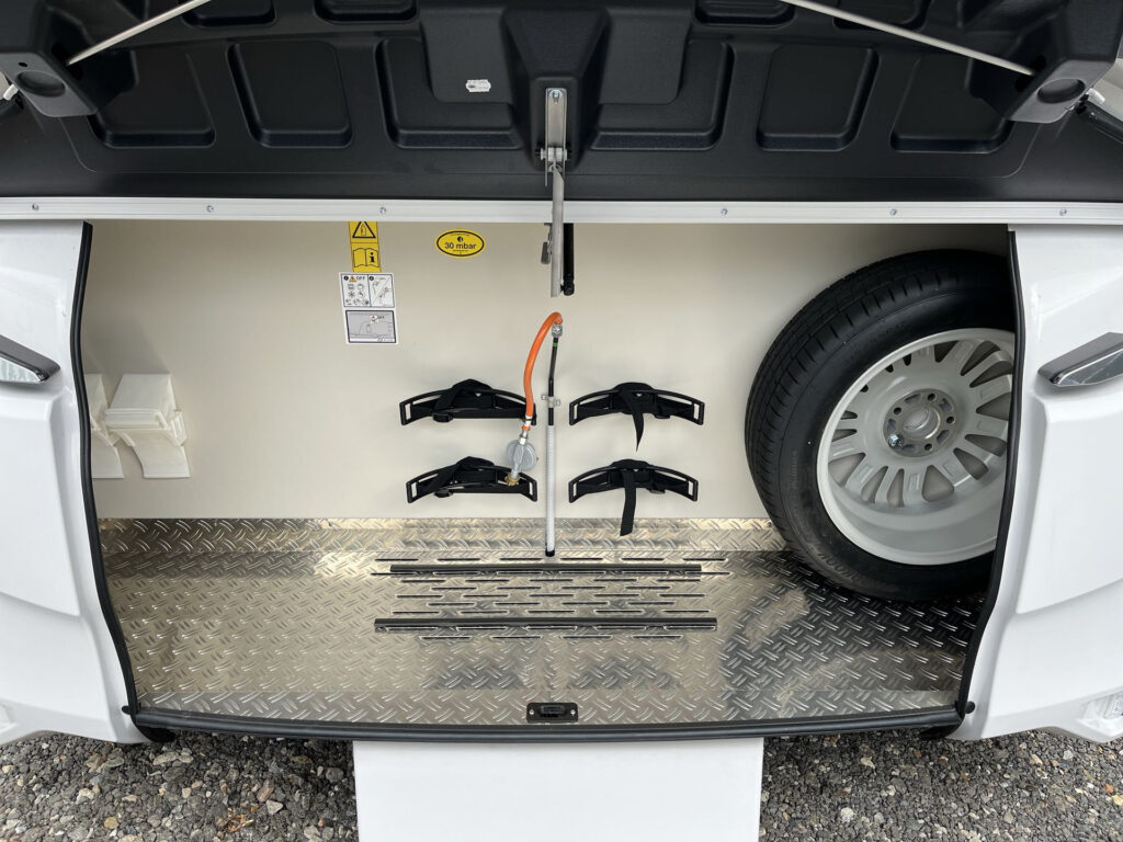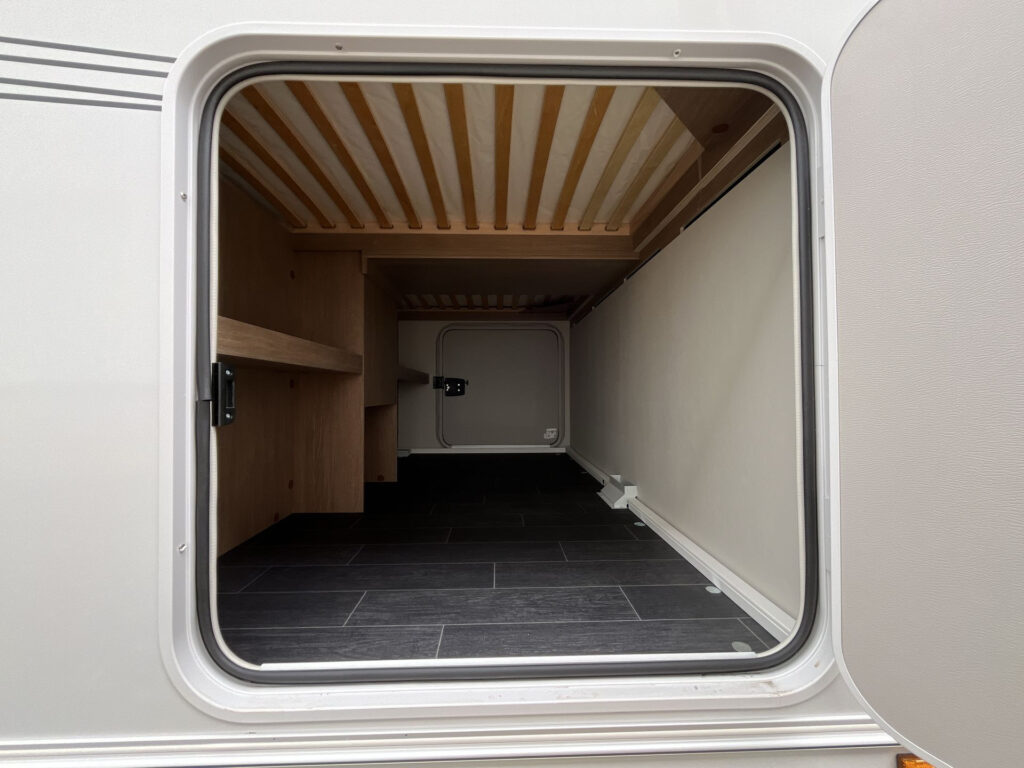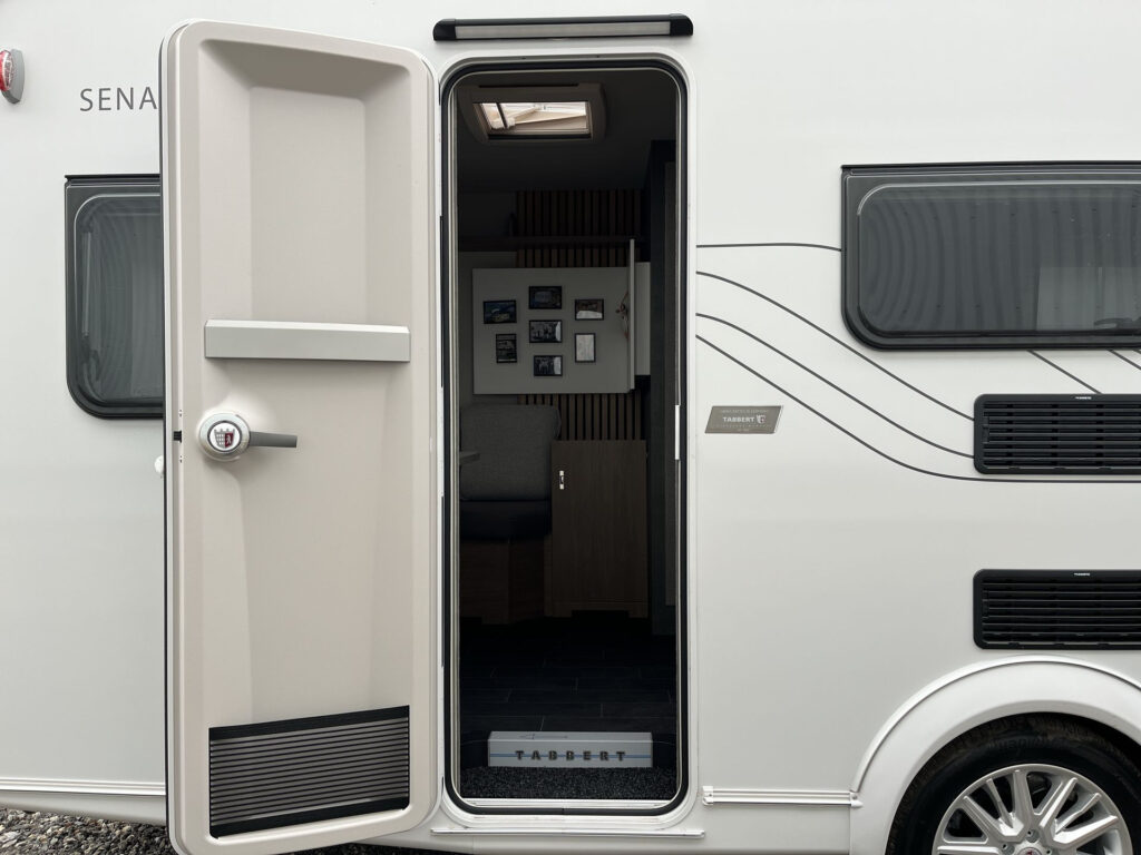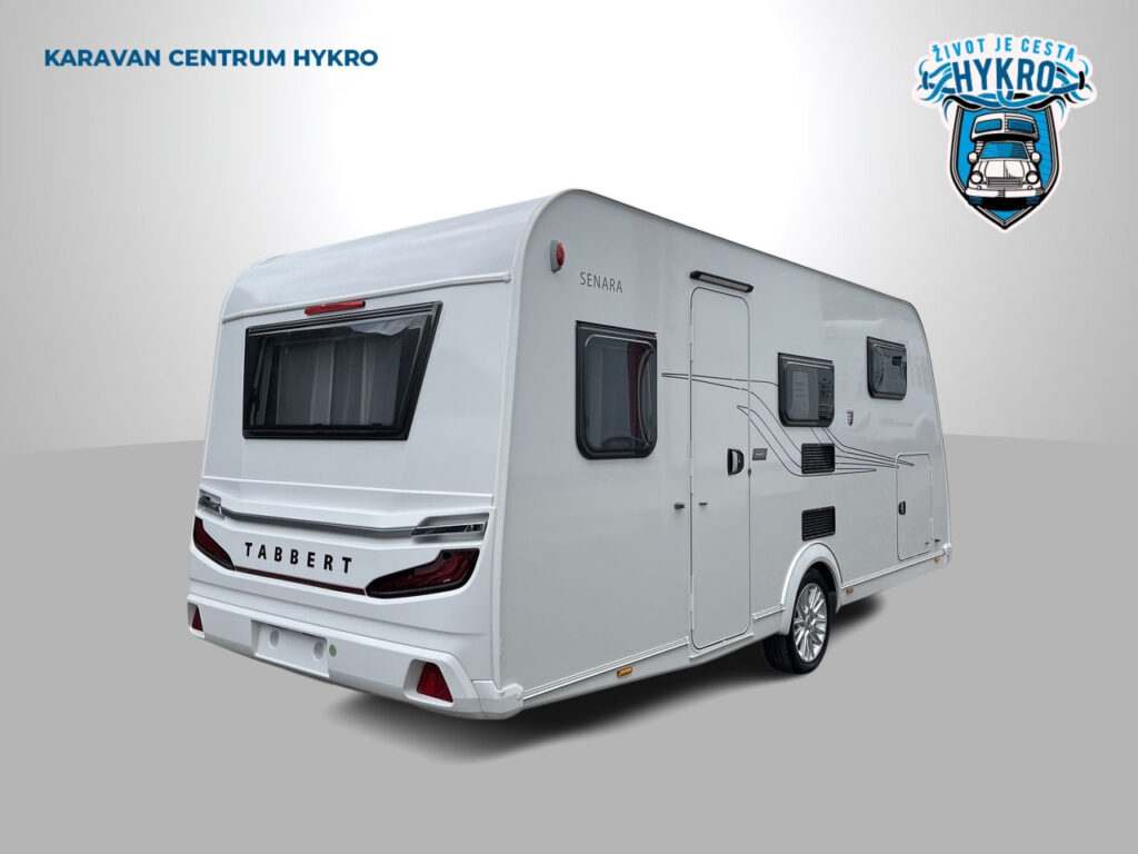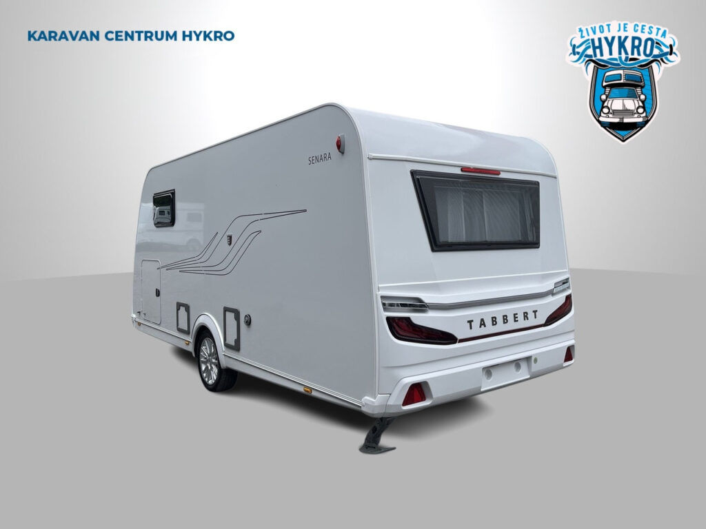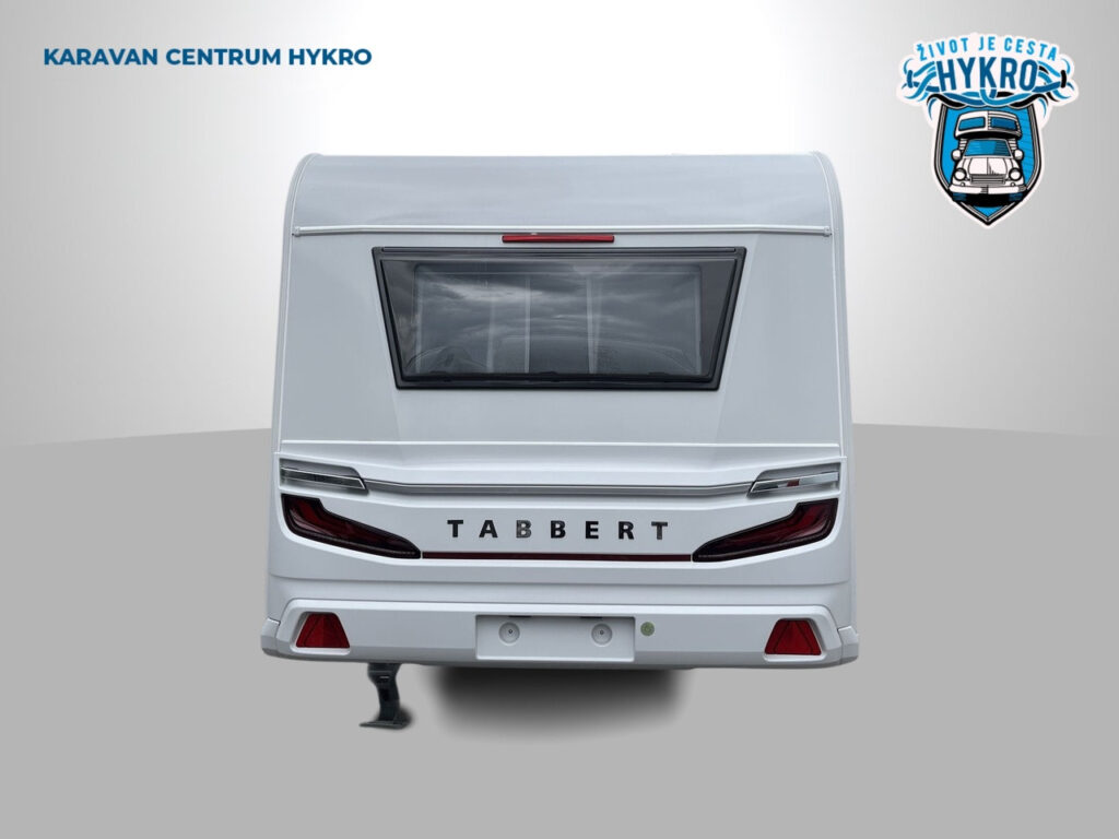NÁSTAVBA: záruka těsnosti nástavby 10 let, vstupní dveře Tabbert Trend, integrovaný vstupní schůdek s logem Tabbert, Tabbert ServiceBox, vnější uzamykatelná servisní klapka levá, garážové dveře 80×80 cm z obou stran, skříňka na plynové láhve s ocelovou podlahou (2×11 kg), okna s kombinovanými roletkami (zatemňovací + moskytiéra), vyklápěcí tónovaná okna se skvělou izolační schopností, 2x střešní okno 40×40 cm s kombi roletkou, střešní okno 28×28 cm s moskytiérou na WC, GFK střecha se zvýšenou odolností proti kroupám, boční stěny z profilovaného plechu „Cool Grey“, zadní světla Tabbert, LED vnější osvětlení