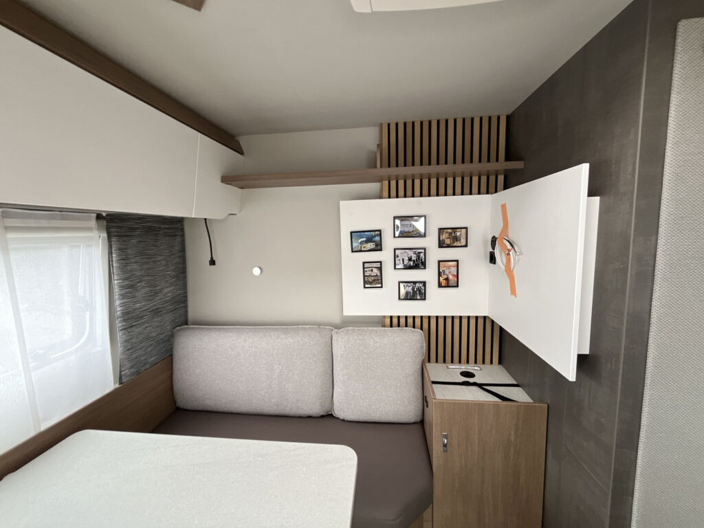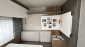 OBYTNÁ ČÁST: skříňky a úložné prostory s odvětráním, vinylová podlaha, látková skládací zástěna (k oddělení ložnice), pevná lůžka s 5-ti zónovými matracemi, chromované rukojeti skříněk, uzávěr Safetylock u horních skříněk kuchyňky, akustická stěna u TV, velký úložný prostor pod postelí, čalounění Silky Leaf