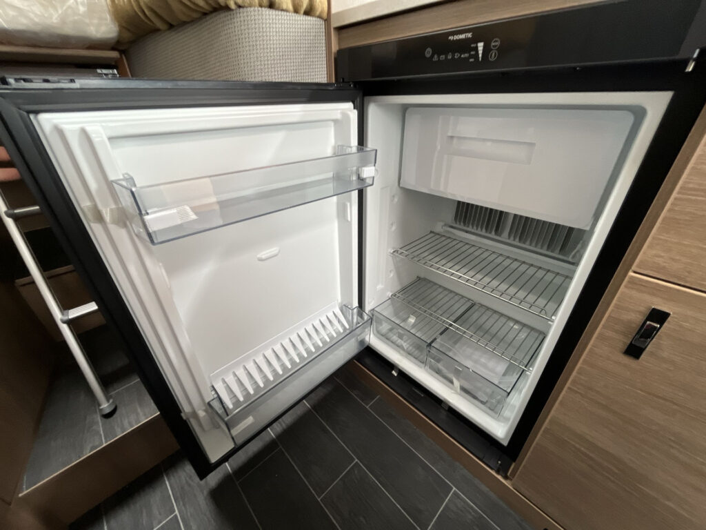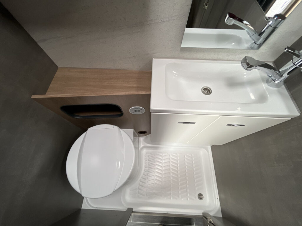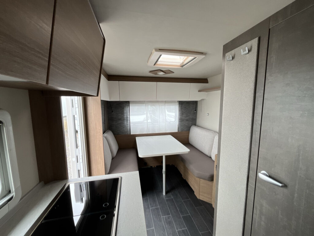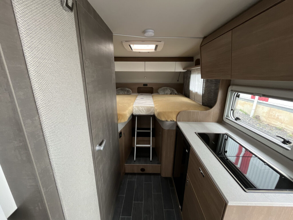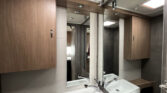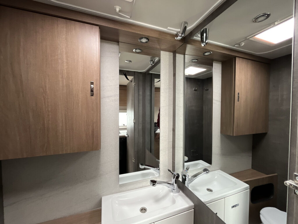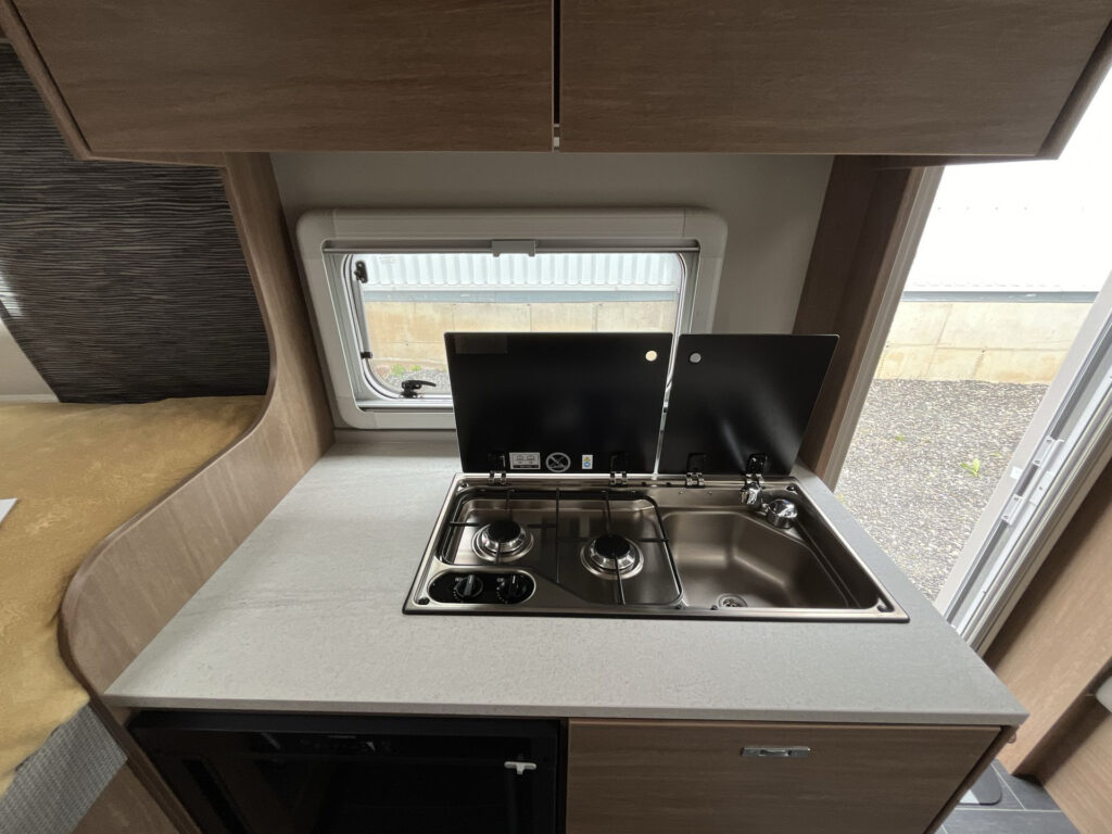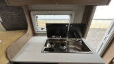 KUCHYŇ / KOUPELNA: kombinace vařiče a dřezu vč. 2 plotýnkového vařiče s elektrickým zapalováním a děleným skleněným krytem, lednice 98 l se systémem AES, skříňka v koupelně se zrcadlem a poličkami, utěsněná záchodová šachta, otočná kazetová toaleta Dometic