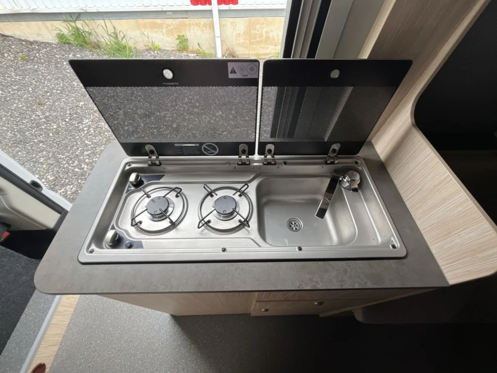 dvouhořákový vařič s nerezovým dřezem a skleněným krytem