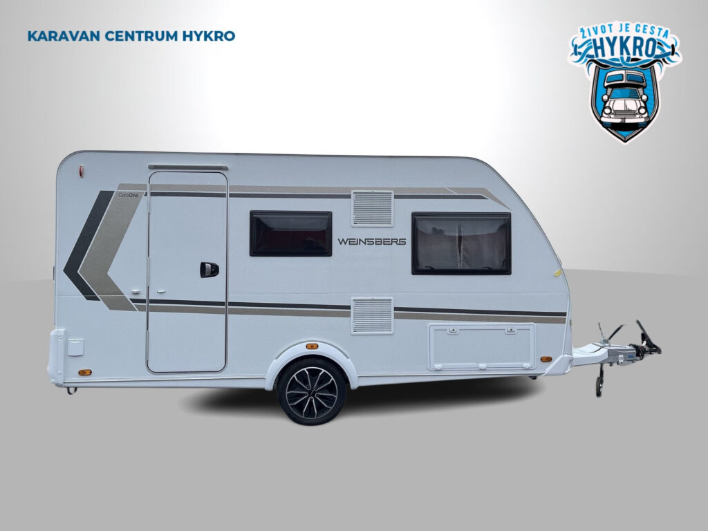 Obytný přívěs Weinsberg 420 QD s celkovou hmotností 1 200 kg skladem. Polstrování STONE WATER.